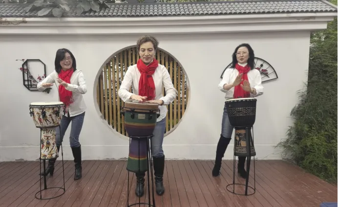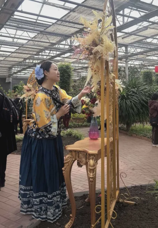 而在鲜切花展区的一角,阵阵欢快的非洲鼓点吸引着往来游客。几位游客围坐在色彩斑斓的非洲鼓旁,跟随着指导老师的节奏轻轻拍打,鼓声时而急促、时而舒缓,在花海中回荡。