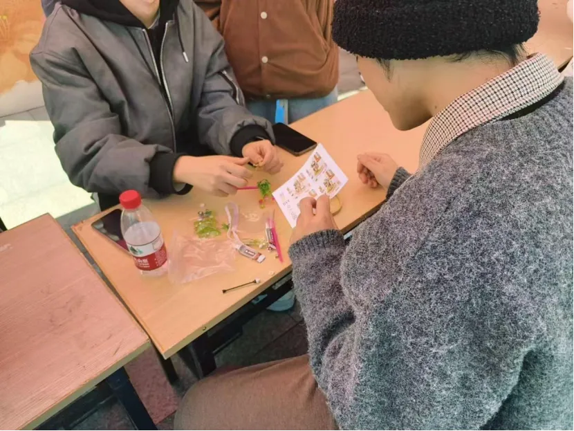 活动现场暖意融融,一张张摆放整齐的桌子上,铺满了苔藓、多肉、蕨类植物,还有形态各异的砂石、玩偶、小摆件等材料。在工作人员的耐心指引下,同学们有序领取工具与素材,围坐在一起开启了微景观的创作之旅。大家充分发挥想象力与创造力,有的以“春日森林”为主题,用翠绿苔藓铺就地面,将小巧的多肉植物错落栽种,再点缀上迷你蘑菇与小鹿摆件,还原出自然野趣;有的偏爱“治愈小筑”风格,用砂石铺成蜿蜒小径,搭配精致的小房子模型,让方寸之间藏起一方温馨天地;还有的结合女神节主题,特意加入花朵、爱心等元素,让作品更添温柔气息。