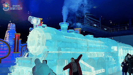馆内网红蒸汽冰火车重磅回归,冰制车头搭载“电控+加压+雾化”装置,可喷出白雾,融合工业风与冰雪艺术。每隔一会儿就喷出一团白茫茫的蒸汽,缭绕在晶莹剔透的车厢周围。工业风硬核浪漫与冰雪艺术之美,就这么奇妙地融合在一起。