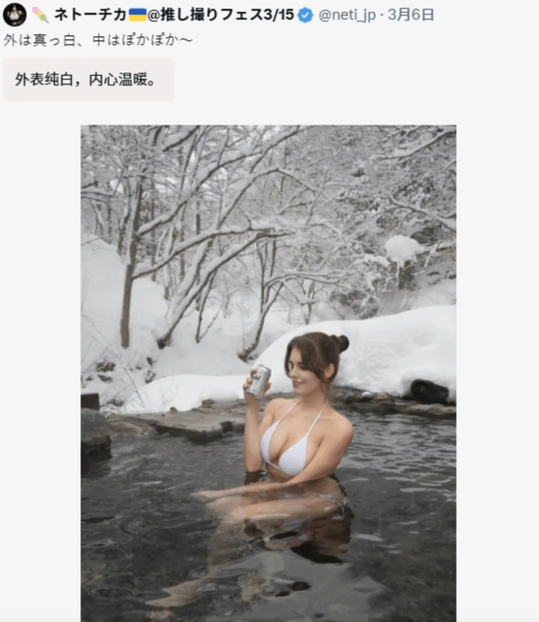 2026 年 3 月 6 日,X平台上一则 “温泉穿比基尼拍照” 的帖子引发热议。一个外国大美女在日本旅游,发布了一张在雪地温泉中身着比基尼、手持罐装饮品的照片,配文 “外は真っ白、中はぽかぽか~”(外面一片雪白,里面暖乎乎~)。