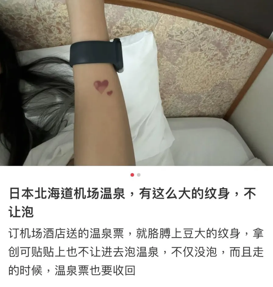 年轻人喜欢表达自我,爱纹身啥的。如果你身上有一处哪怕只有拳头大小的纹身,对不起,大部分日本温泉都会把你拒之门外。纹身不行!这是日本泡澡非常重要的一个规则。