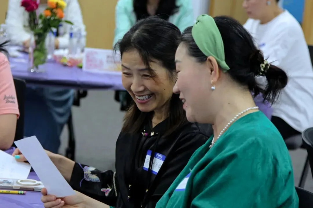 活动现场以紫色为主题色调,象征女性的优雅与力量。现场每一张桌子都摆放着鲜花与气球,并以不同花语作为桌牌名称,如牡丹组、兰花组等,格外引人注目,不仅增添了活动的仪式感,也为小组交流营造出温馨的氛围。