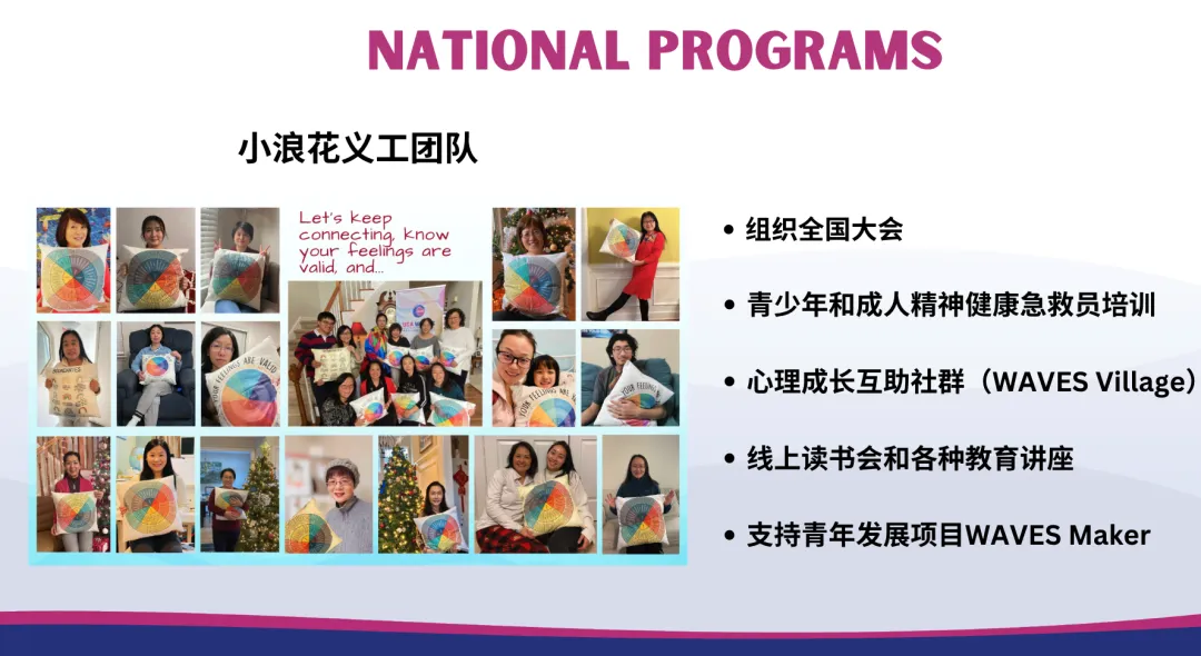 多年来,UCA WAVES 在全美开展了多项心理健康项目,包括全国亚太裔青少年心理健康峰会、青少年与成人精神健康急救员培训、心理成长互助社群 WAVES Village,同辈支持小组活动以及线上读书会、教育讲座等。