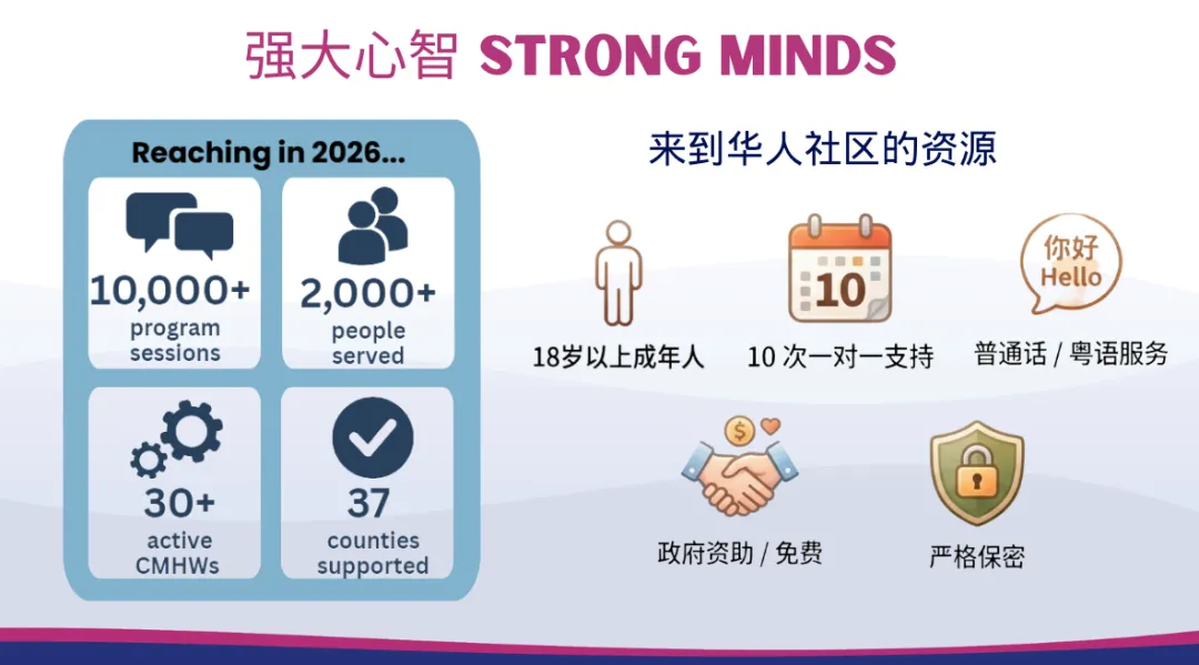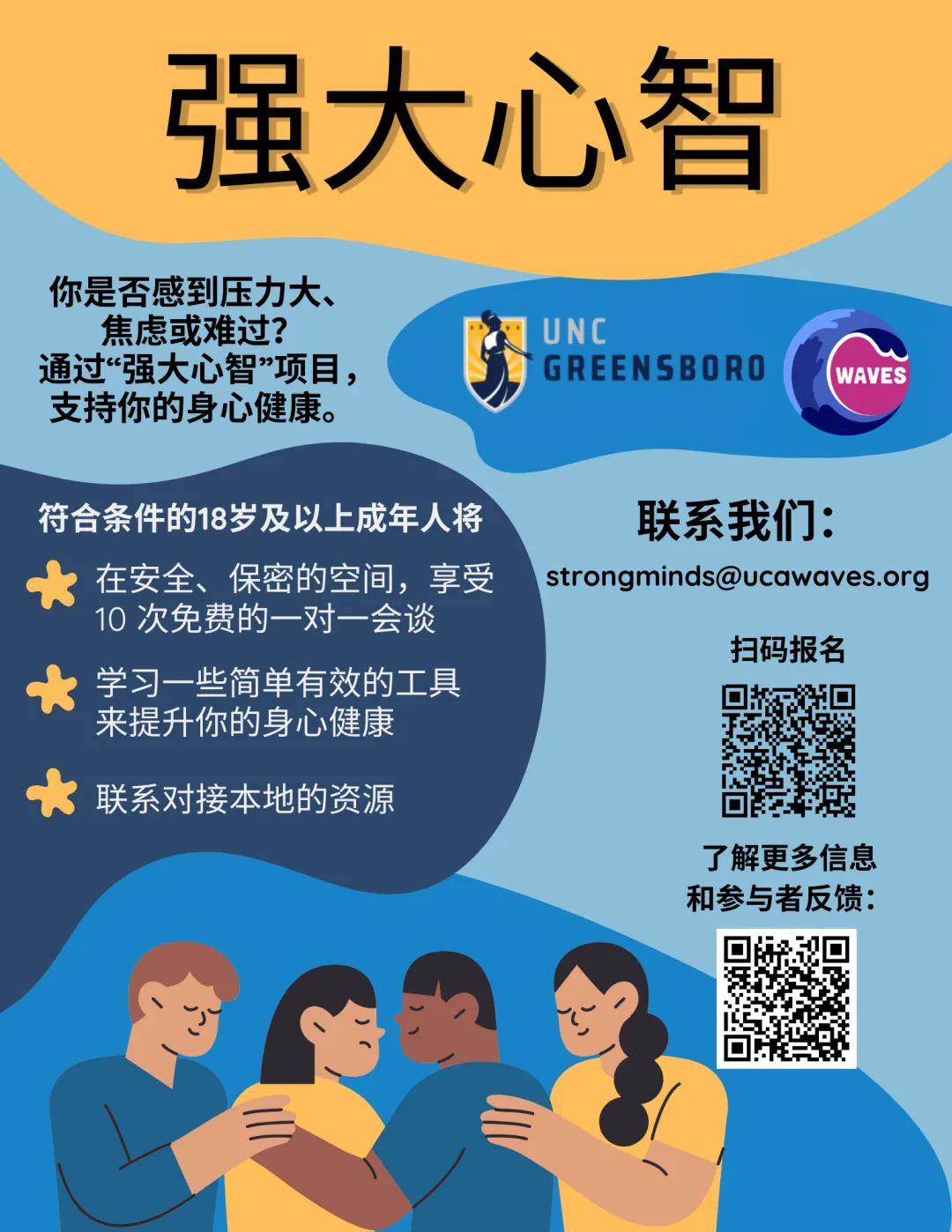 活动中,WAVES社区健康工作者黄祯贞介绍了 Strong Mind(强大心智)项目,该项目由北卡州政府资助,和北卡罗来纳州立大学Greensboro校区合作,专门为双语社区提供免费的自我关爱与情绪健康支持。