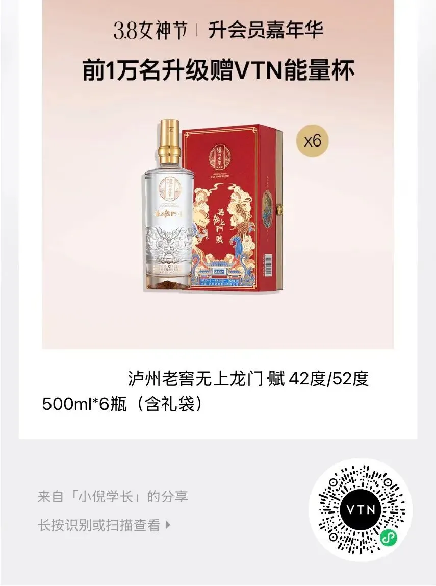 当前位置:首页>美女资讯>VTN3.8女神节-泸州老窖无上龙门·赋 42度/52度 500ml*6瓶(含礼袋)