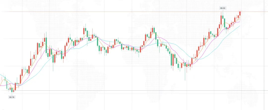 2、建议在94.3-94.6美金附近做多,止损0.3个点,目标看99.3-105.9美元附近即可;