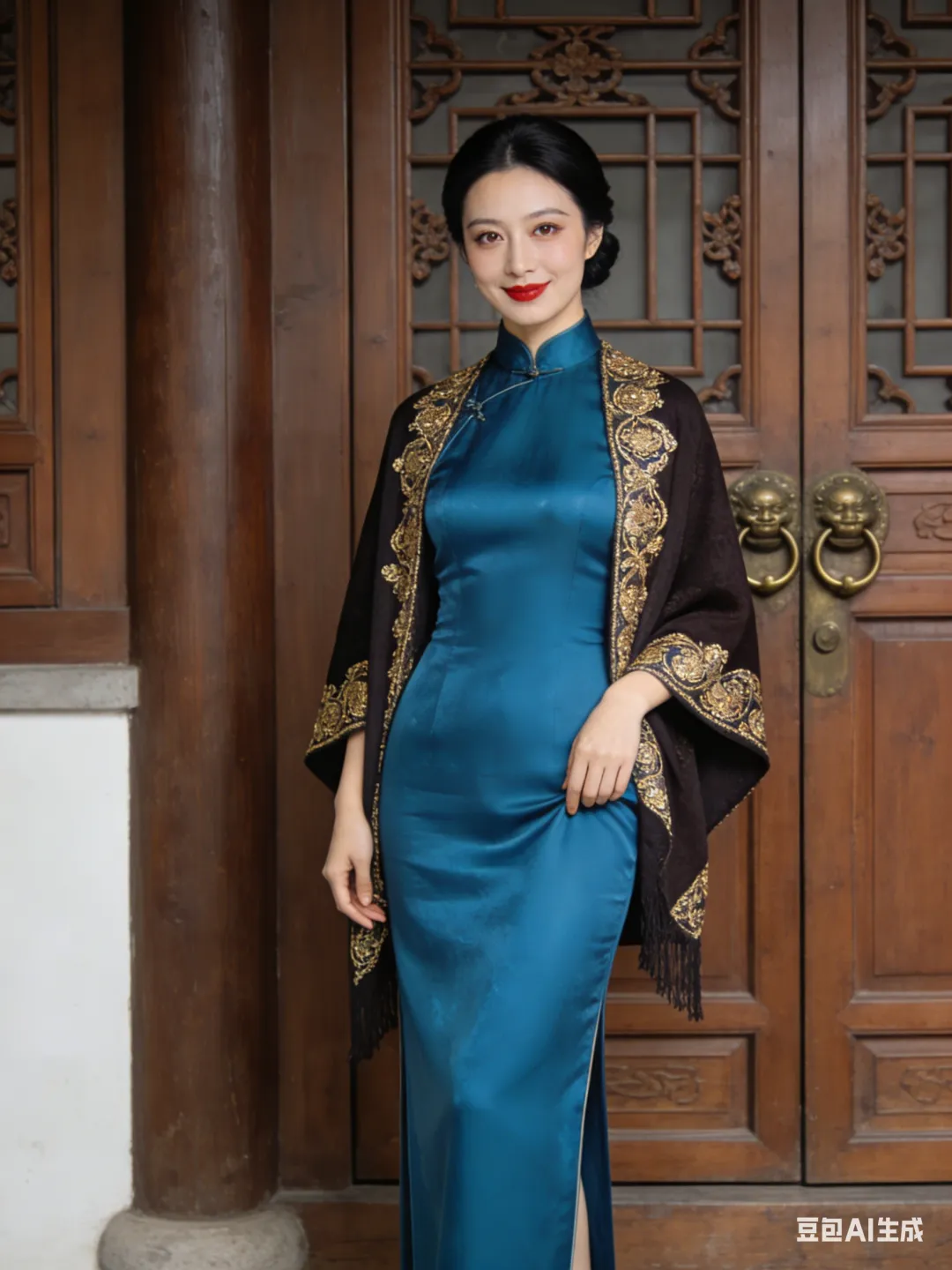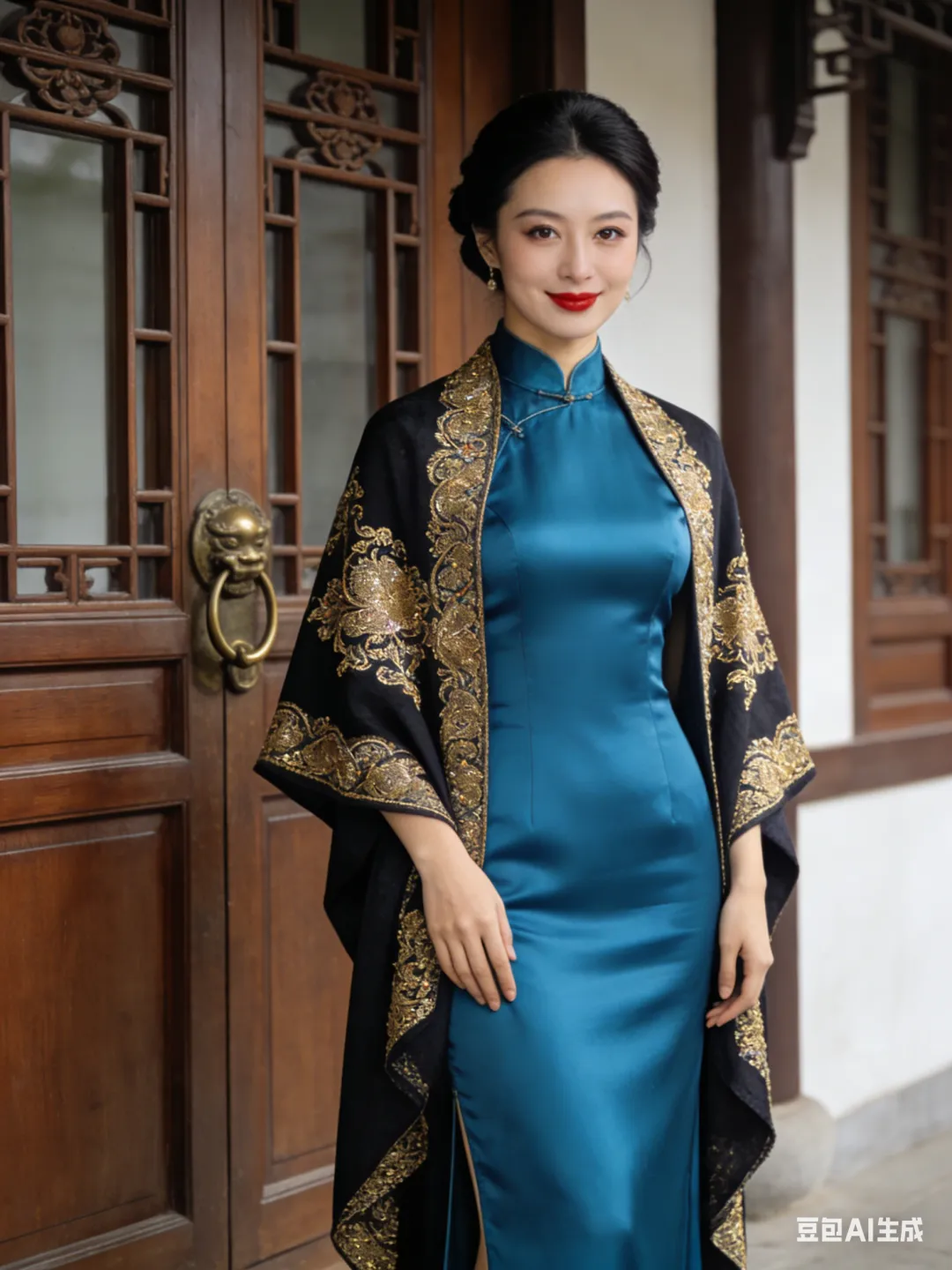 服饰:身着孔雀蓝色旗袍,旗袍线条修身,凸显身材曲线,面料质感上乘,光泽细腻;搭配金丝高档刺绣深色披肩,披肩刺绣工艺精湛,金丝绣线勾勒出精美的图案,增添高贵华丽感