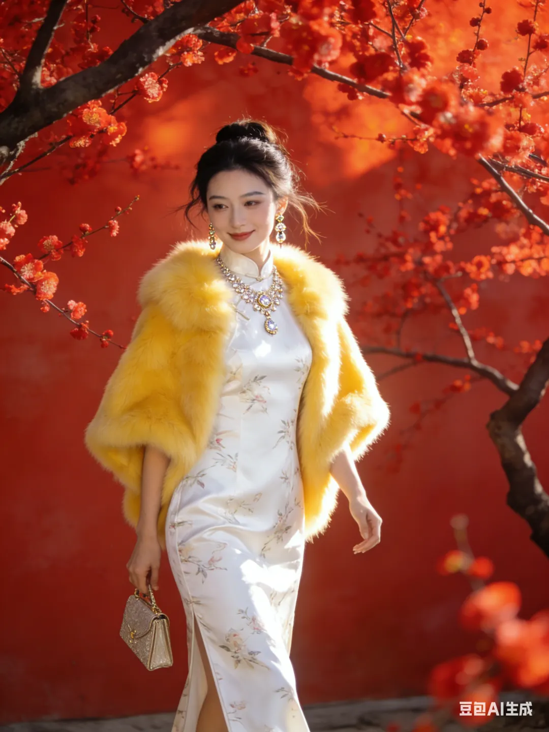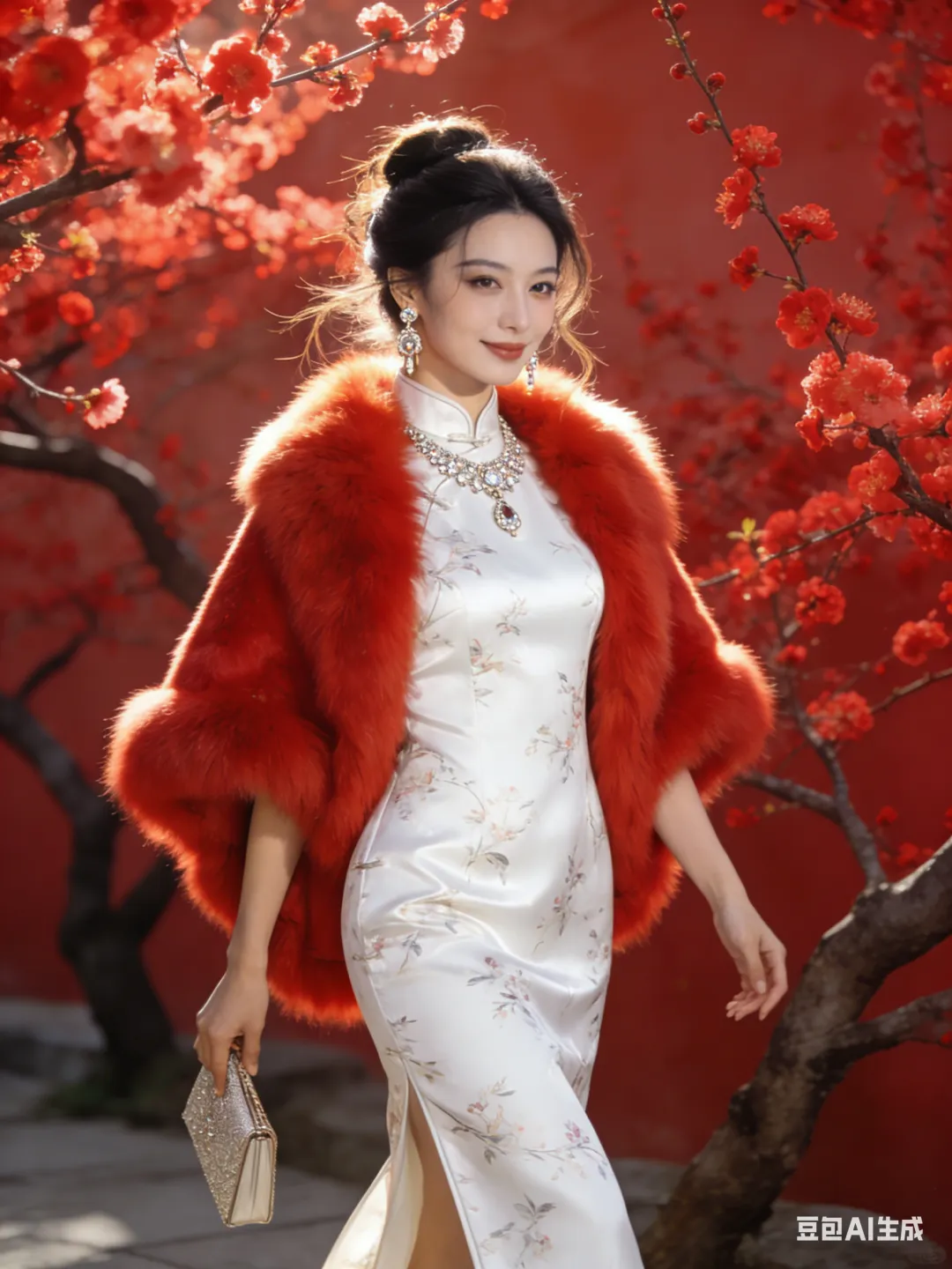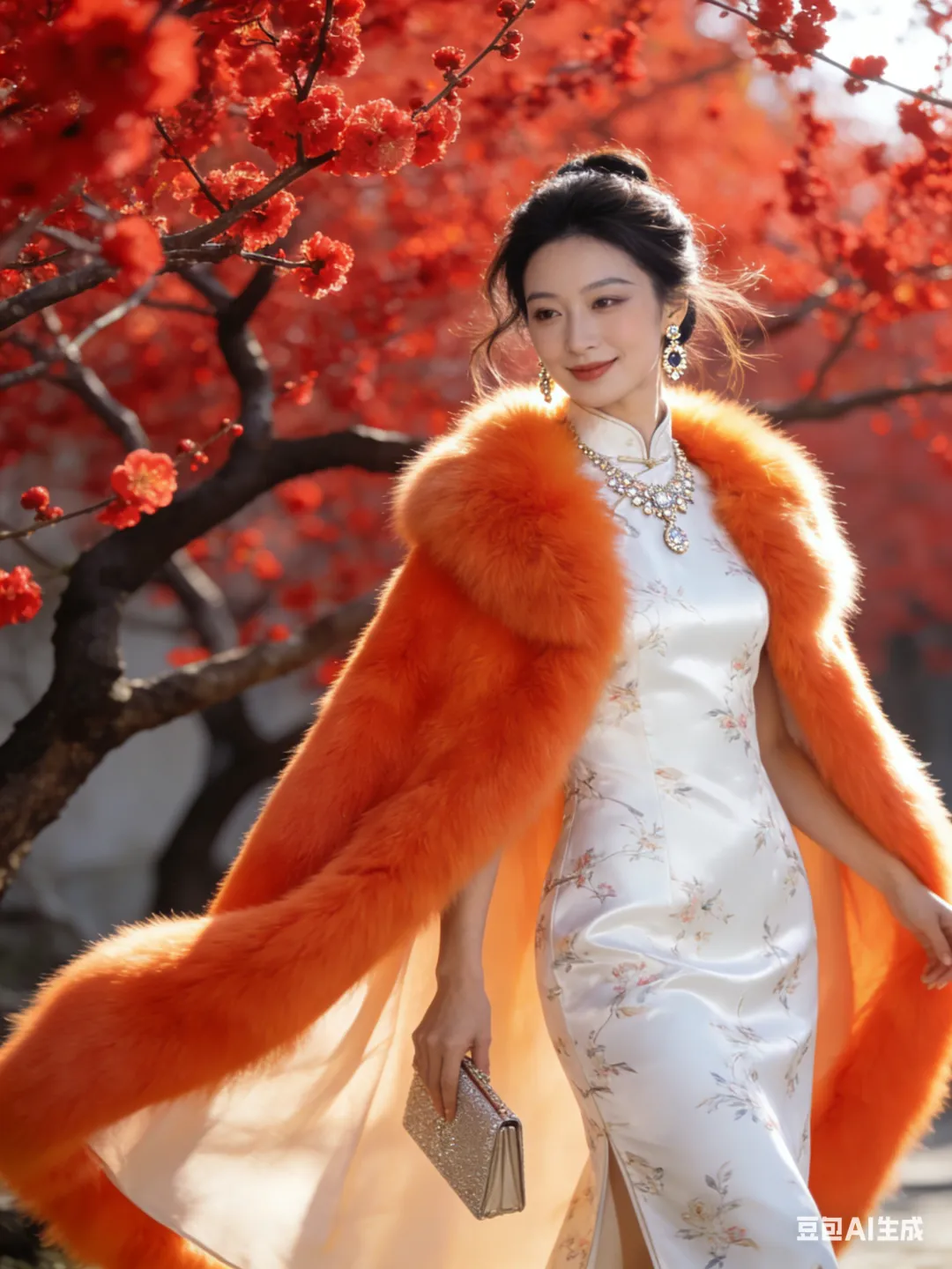 服饰:身着白色印花高档旗袍,旗袍面料光滑柔顺,印花精致细腻,凸显独特品味;搭配色泽鲜艳明亮的高档毛毛旗袍领斗篷,毛毛质感蓬松柔软,提升整体造型的华丽度。