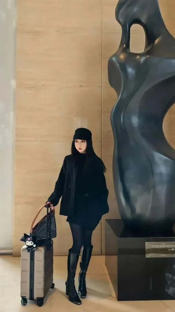 机场造型没她不马虎。宽松黑色毛绒外套保暖又时髦,穿上面下配黑丝、高筒靴的人看上去很随性。她一手提着行李箱,一手拎着大托特包,身边的雕塑装饰与她意外地搭配起来。这不是在赶飞机,在拍时尚大片。