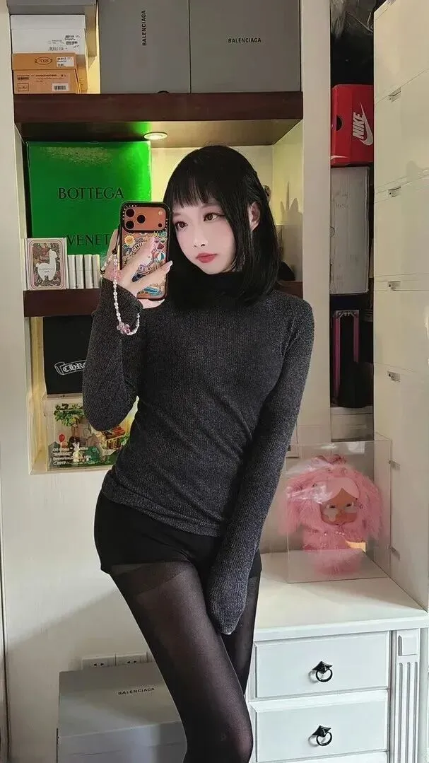 回到家之后她就从冷漠变回了软萌可爱。深灰色的针织上衣搭配黑色短裤,脚踩着一个品牌收纳盒。对着镜子自拍的时候,她笑得满脸红扑扑的。背景当中布满了购物袋和玩偶,洋溢着浓郁的少女气息。酷女孩也一样爱收集可爱小物。