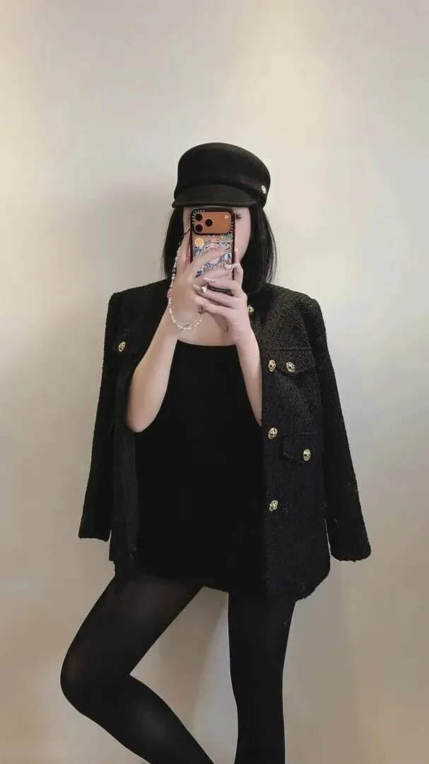 先看一下她的日常出街造型。这套黑色的小香风外套短款设计显得利落而精神。金色纽扣嵌入在布料里像星星一样闪耀着光亮。她选了一条修身连衣裙,整个人显得优雅大方。报童帽戴在脑袋上,一只手托着,一只手抱紧自己,一副无所畏惧的样子。这样一种“我好看但是我不刻意”的气质,确实很能打动人。手中黑色菱格包里装着一串金属链子,在灯光的照射下泛起淡淡的亮光,增添了它一丝精致的气息。