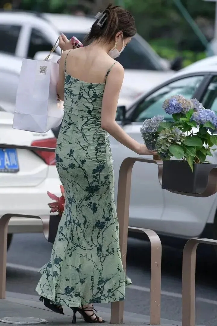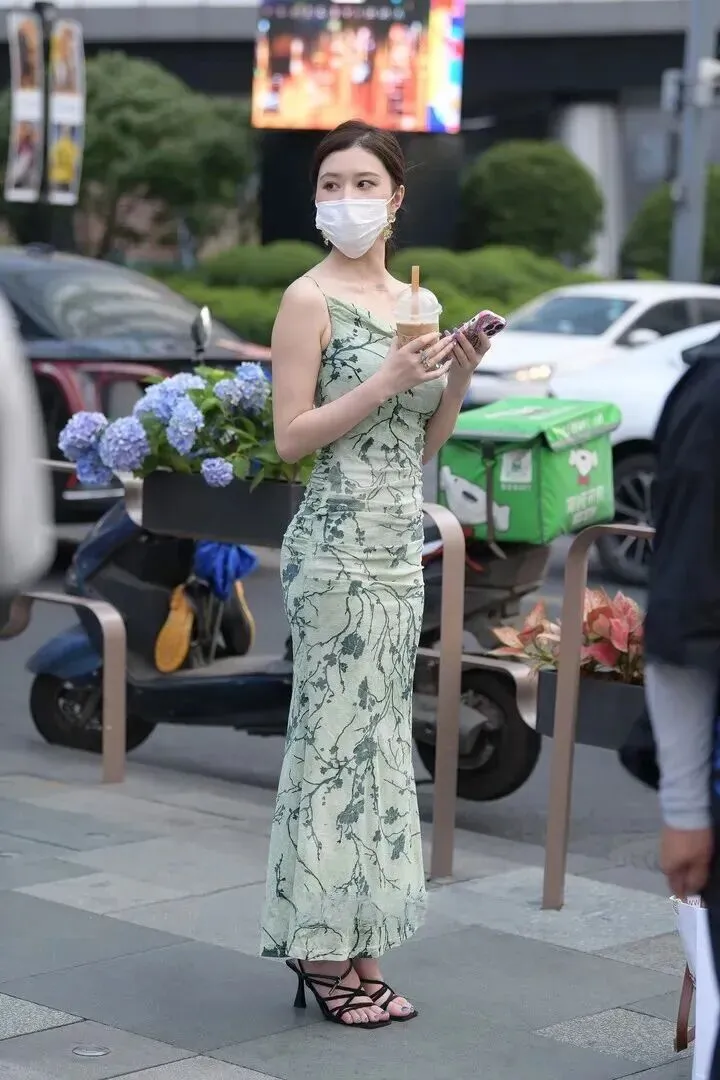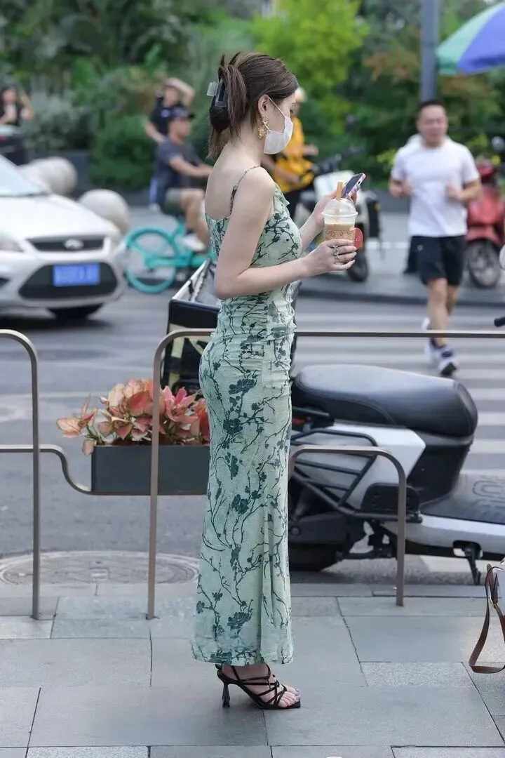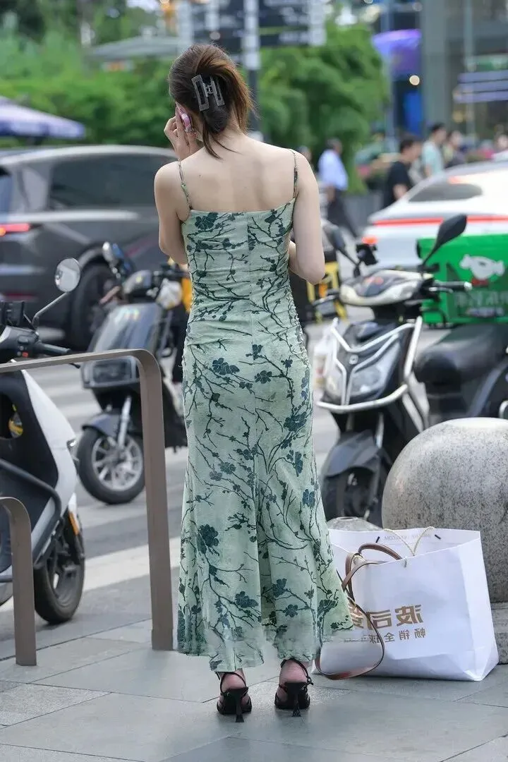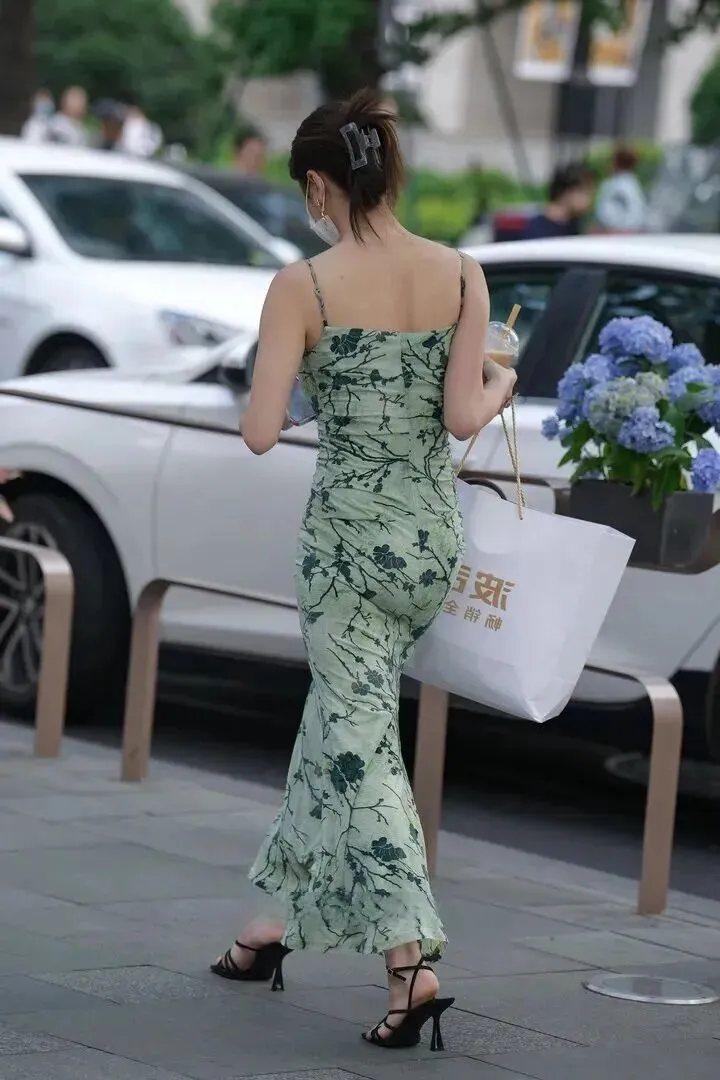 走路时裙摆飞舞,低马尾搭配凉鞋是清爽的感觉。手持手机和包的实用和美观并存。背影一望就有一条挺直的肩膀和欢快的脚步感,在平白无奇的形状里也能看到其优雅。