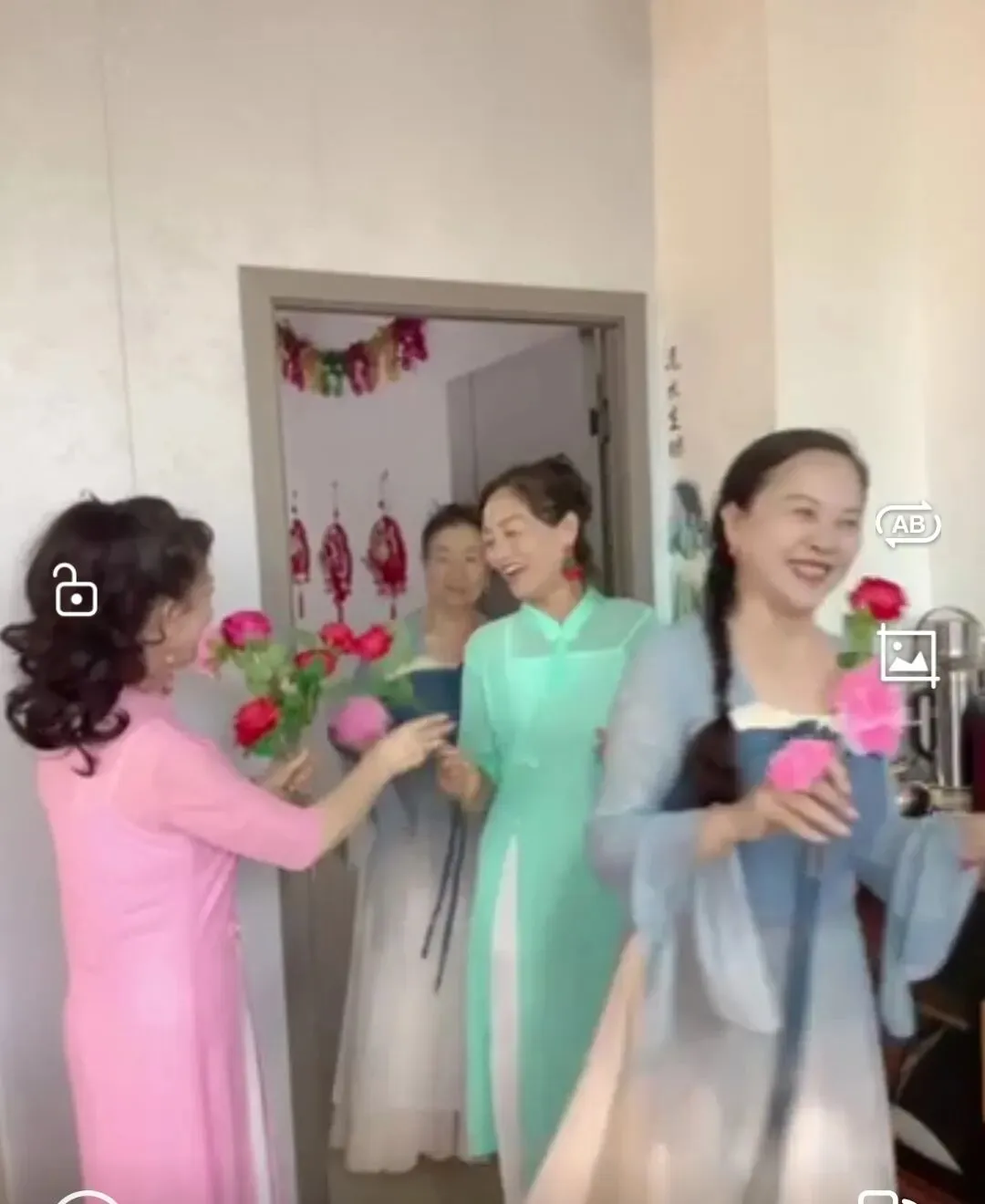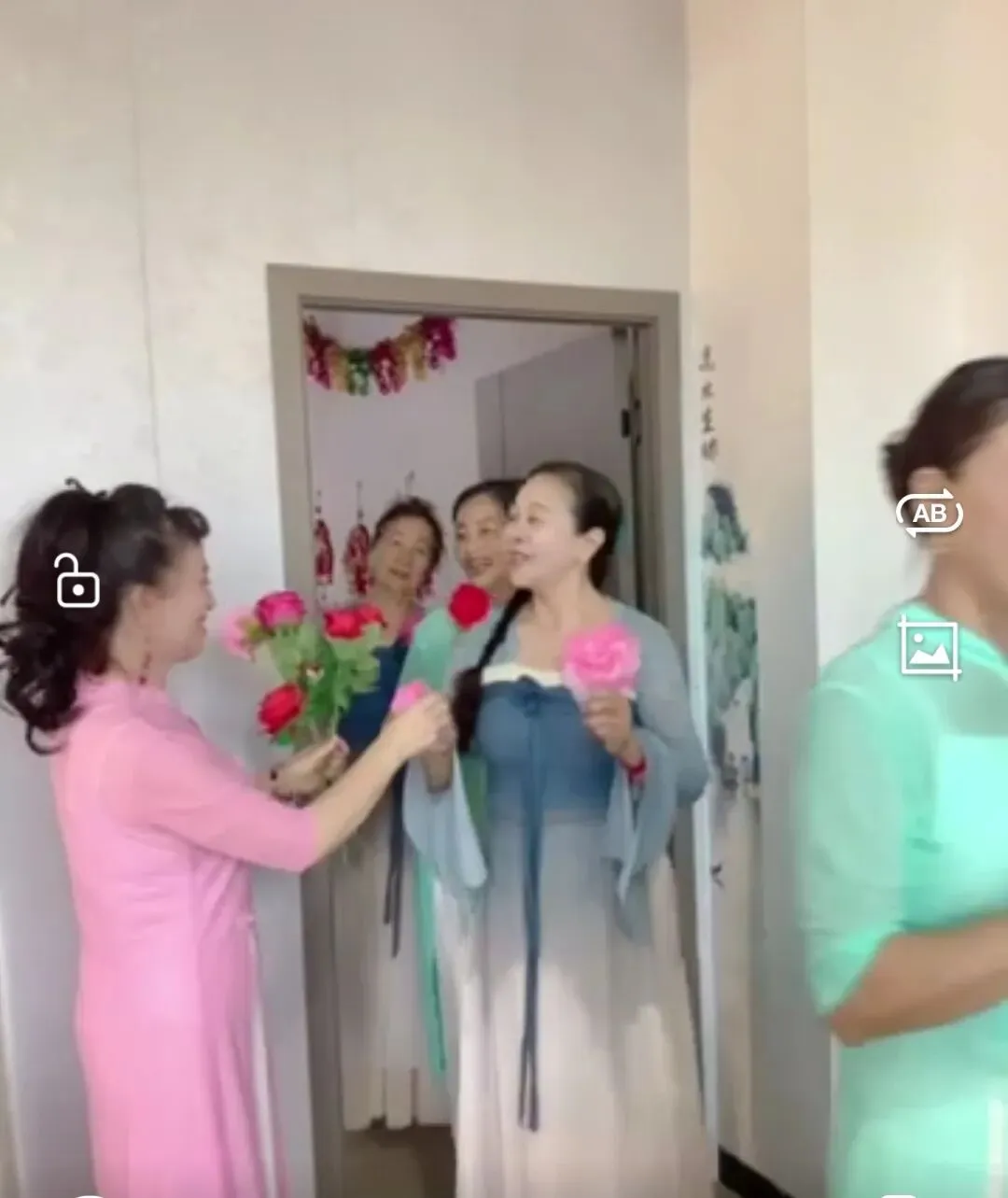 最让人心里发烫的,是那阵献花的小仪式。我们团长穿着粉色汉服捧着一束束红玫瑰,挨个递给走进门的我们,大家接过花的时候,脸上都笑开了花,眼里闪着光。这哪里是一束花啊,这是咱们姐妹之间的惦记和情谊,是对彼此在舞台上努力的认可,也是对往后日子的美好期许。