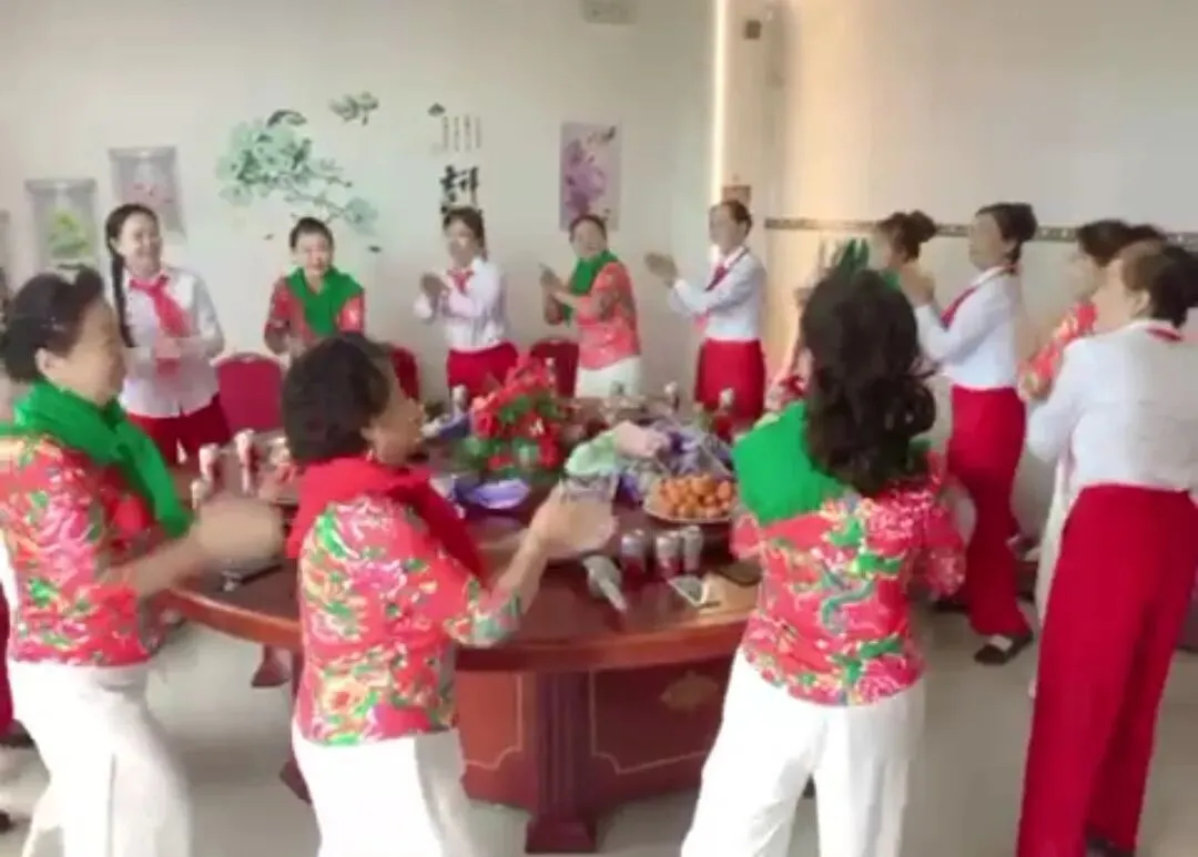 姐妹们一见面,话匣子就关不上了。你拉着我的手,我摸着你的肩,念叨着最近练舞的趣事,分享着生活里的小开心,笑声一阵接着一阵,把屋子都填得满满当当。为了这次聚会,咱们还特意准备了几套好看的衣裳:一套是浅绿色旗袍,还有蓝灰色的汉服,别着娇艳的红粉胸花,往那儿一站,温婉又大气;另一套是红底大花的上衣,配着绿围巾或者红领巾,喜庆得像过年,还有白上衣配红裤子,穿上就想跟着节奏走两步。