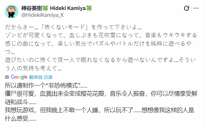 此前神谷英树曾在社交媒体上半开玩笑地表示,希望游戏能加入一个“不吓人模式”,这样他就能安心体验解谜和战斗,而不用被恐怖氛围折磨。他甚至调侃说,如果血迹能变成飘落的樱花花瓣就更好了。