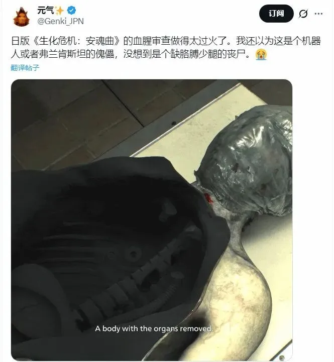 原版中,这类尸体腔体非常血腥逼真,但日版处理后整块腔体被涂成黑色。博主吐槽称,日版的血腥审查做得有些过火——起初他还以为这只是机器人或傀儡,没想到居然是一具缺少器官的丧尸。