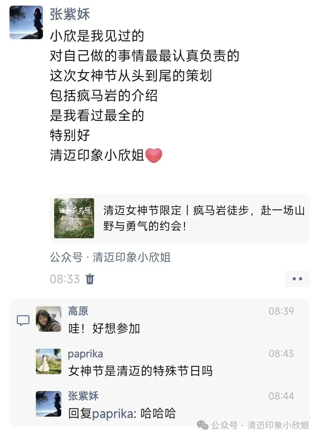 紫姀在朋友圈转发了我写的清迈女神节疯马岩徒步文章的,底下有人不明所以,问“女神节是清迈的特殊节日吗”?