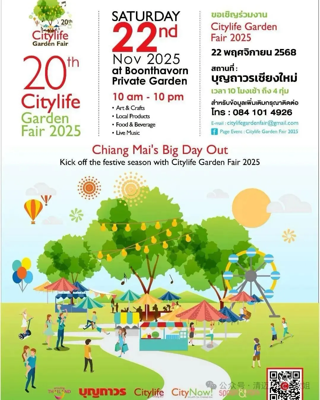 清迈是一个很有情怀的地方,是一个妥妥的节日城,每个节日都是传了一届一届,有政府组织的合全城之力举办的“鲜花节”、“泼水节”、“唐人街春节”,也有民间企业、团体、个人组织的各种节日,比如Citylife garden fair,20年前撒下的小种子,如今办到了第20届,虽然一年只有一天,但一天有近1万多人参加。