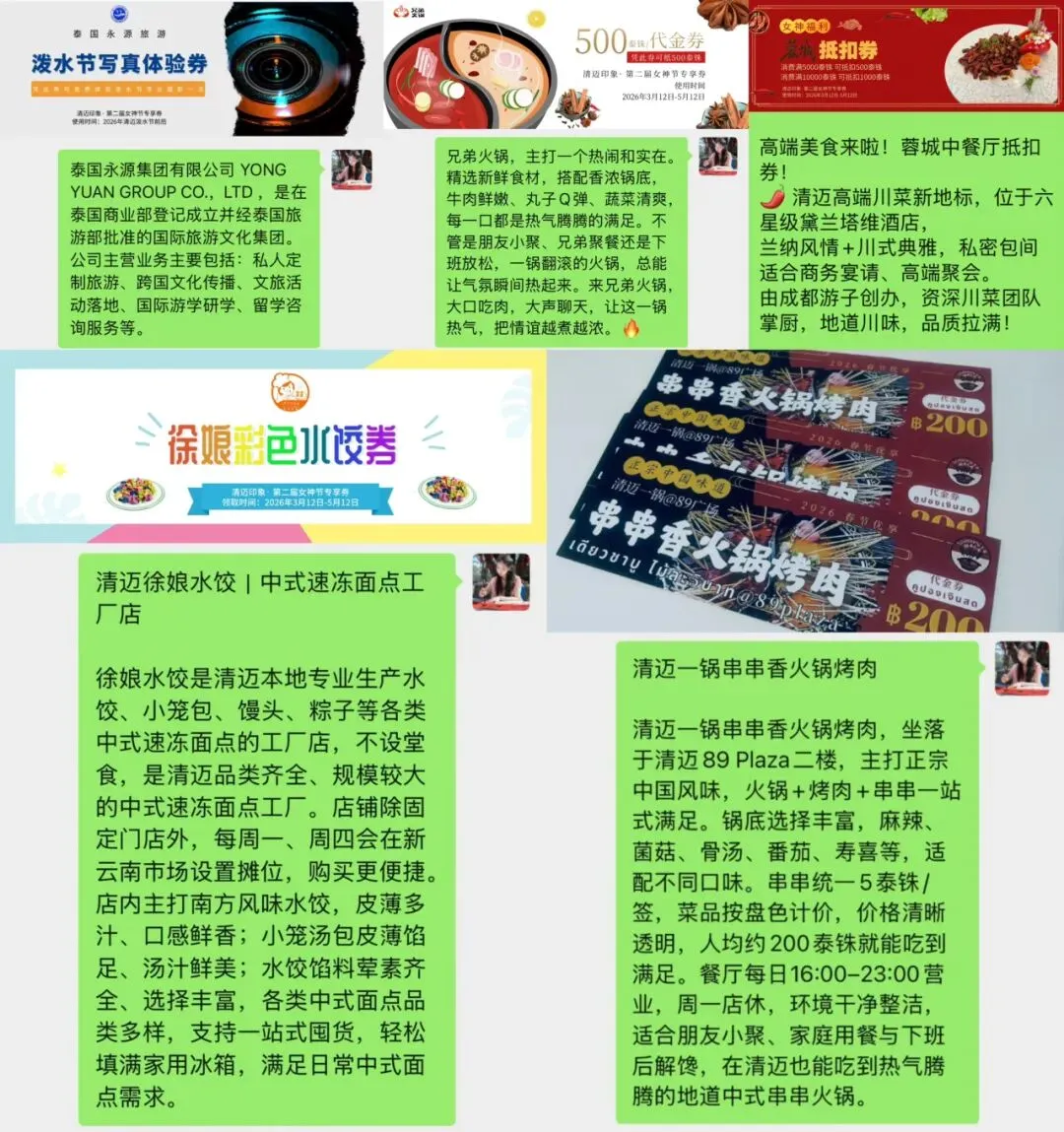 乐珂手作、泰国永源旅游、清迈兄弟火锅、清迈89广场一锅串串香、蓉城中餐厅、徐娘水饺、狮途快运。