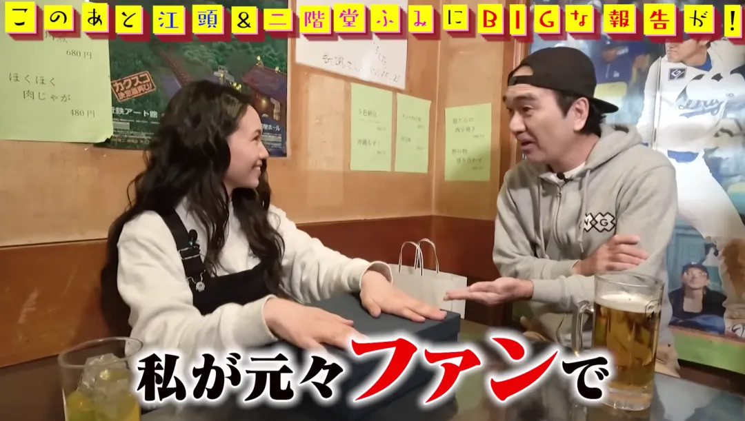 江頭が二人の出会いについて聞くと、二階堂は「お友達が紹介してくださったんです。私が元々ファンで…」と告白。