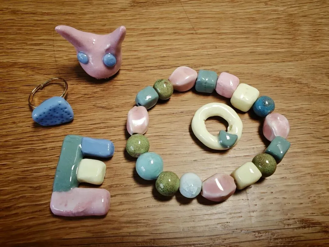 做了手链、戒指,两个香插、两个杯垫,还有一只小小的首饰盒。又捏了字母 E 和 Q,刚好可以当项链吊坠;还有一只小动物,摆在家里就是独一无二的小摆件。满满一桌子,都是亲手做出来的小温柔。