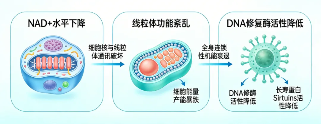 科学研究明确指出:NAD+水平下降,会直接破坏细胞核与线粒体的正常通讯,导致线粒体功能紊乱、细胞能量产能暴跌,同时大幅降低DNA修复酶与长寿蛋白Sirtuins的活性,进而引发全身连锁性的机能衰退,这也是衰老与亚健康的核心分子机制。