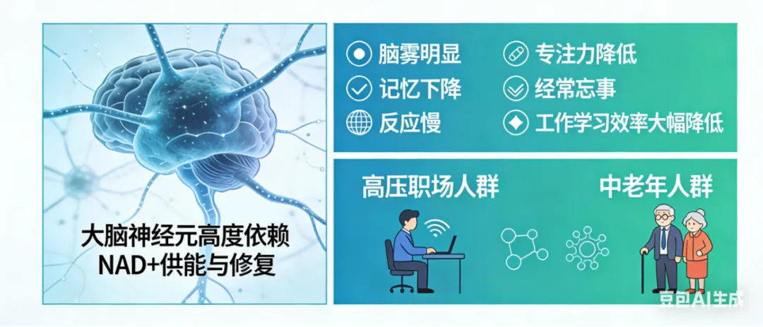 大脑神经元高度依赖NAD+供能与修复。NAD+不足会导致大脑能量短缺、修复受阻,出现脑雾、反应慢、专注力与记忆力下降,高压职场人群和中老年人群表现尤为明显。