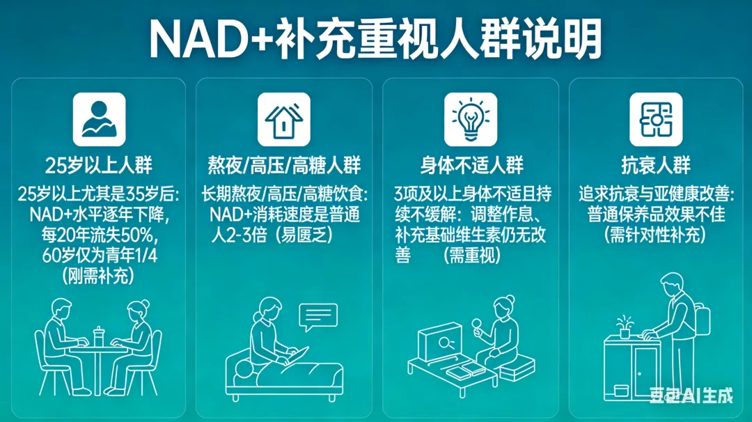 结合研究与人群特征,符合以下任一情况,就应重视 NAD+补充,不必盲目依赖普通维生素:25岁以上尤其是35岁后NAD+水平逐年下降,每20年流失50%,60岁仅为青年时期的1/4,属于刚需补充人群;长期熬夜、高压、高糖饮食人群NAD+消耗速度是普通人的2-3倍,极易出现匮乏;出现3项及以上身体不适且持续不缓解,通过调整作息、补充基础维生素仍无改善;追求抗衰与亚健康改善,普通保养品效果不佳。