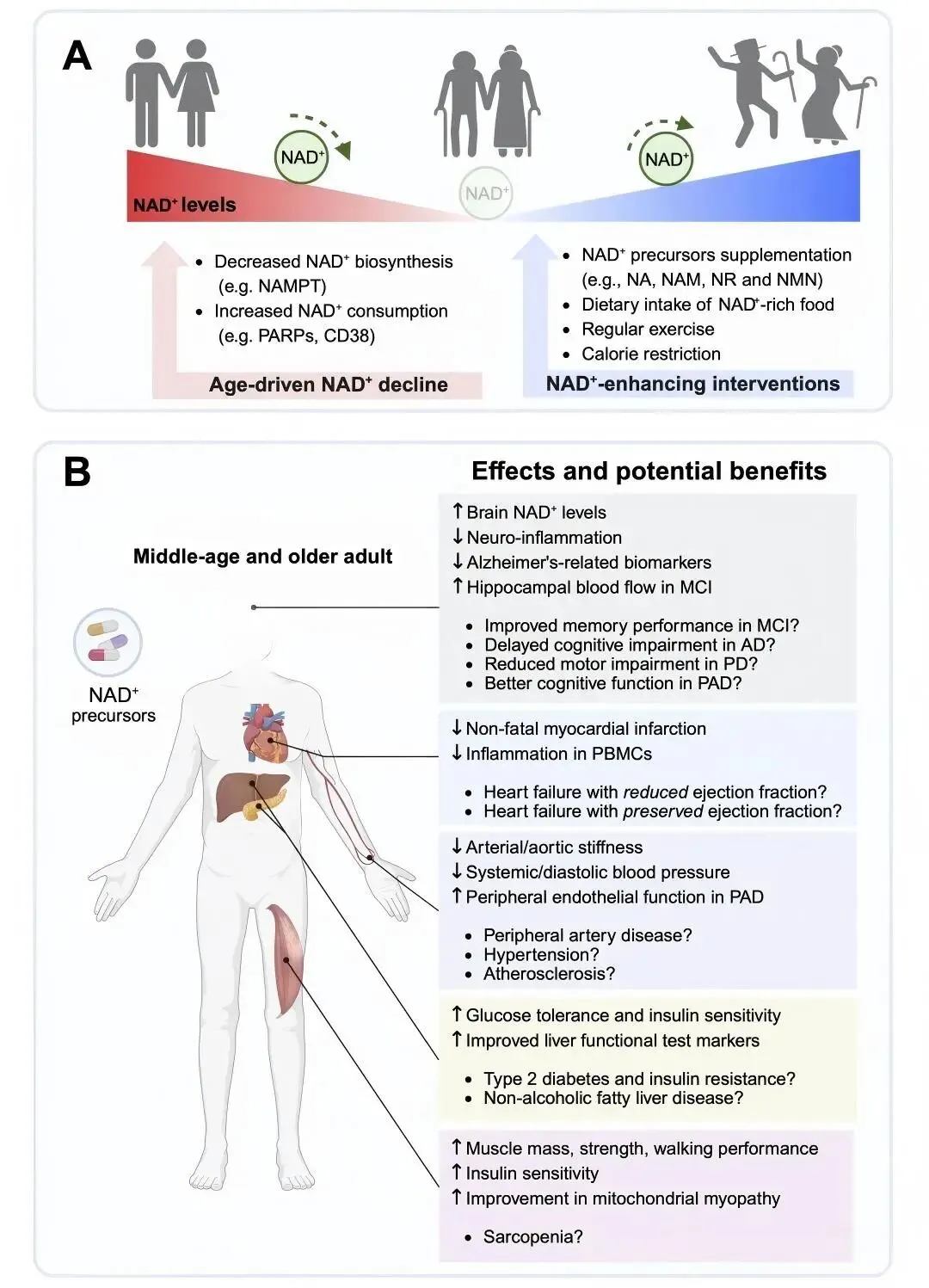 图2. NAD+补充治疗与年龄相关疾病的临床结果和潜在益处