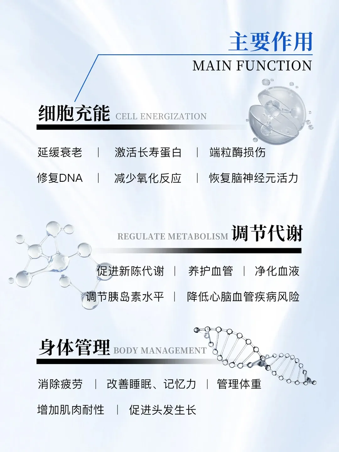 NAD⁺ 在能量产生中起着关键作用,并改善细胞中线粒体的功能。这有望提高那些缺乏能量或慢性疲劳的人的能量水平。