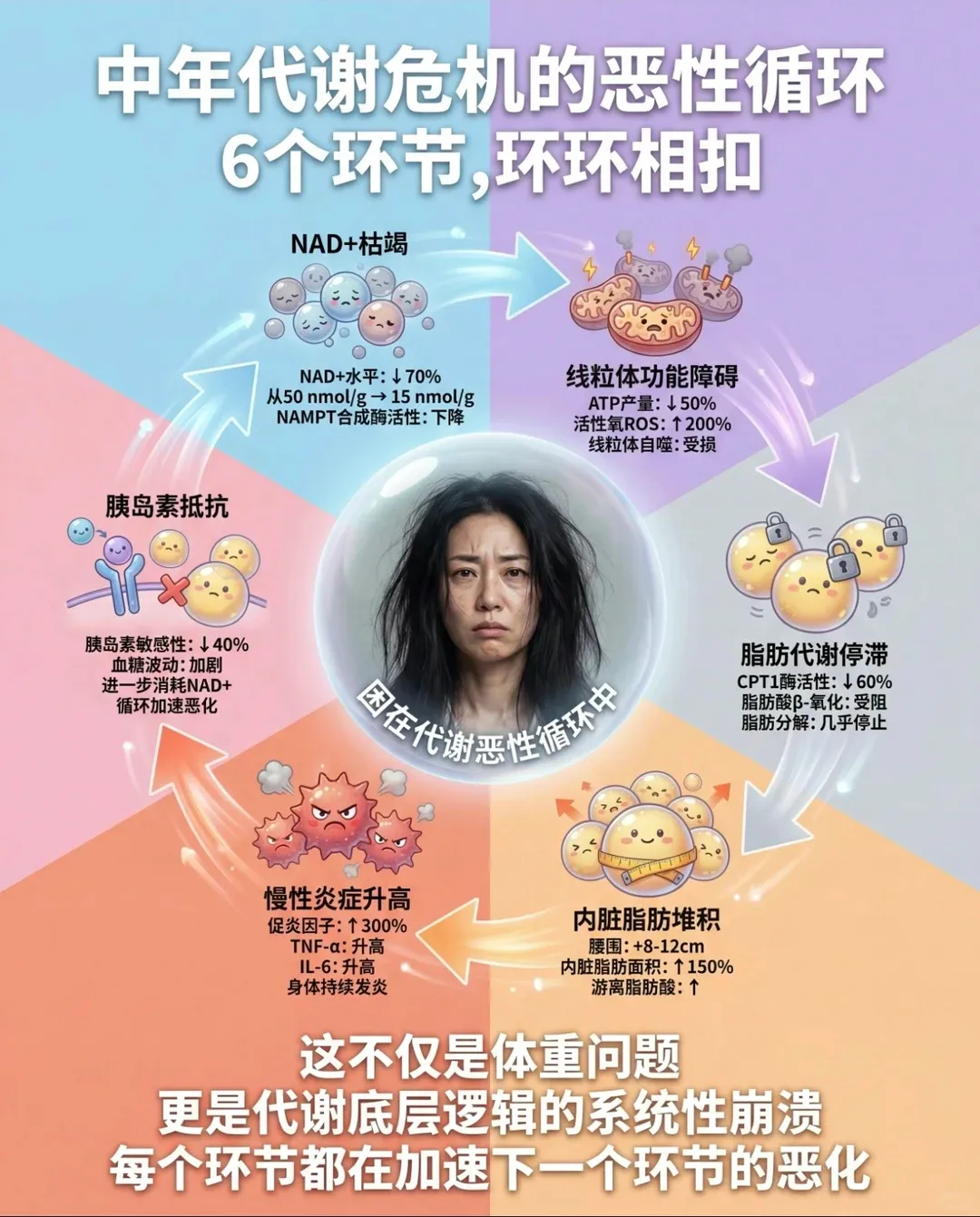 NAD+缺乏,免疫细胞如同“失去弹药”,吞噬病原体的效率下降40%,身体抵抗力变弱,换季容易感冒、感染,伤口愈合、身体恢复速度变慢,长期处于易生病的亚健康状态。