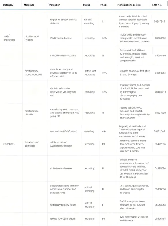 不久前,麻省理工学院的Leonard Guarente、哈佛医学院的David A. Sinclair等研究人员在《Cell Metabolism》期刊上发表综述[3]系统总结了截至论文发表时全球医疗、研究机构围绕哈佛NAD+提升技术和senolytic(梅奥希诺裂®)的人体衰老干预临床试验进展