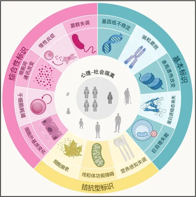 最新模型将14个标志分为“外层机制”(如基因组不稳定、线粒体功能障碍)与“核心枢纽”(心理-社会隔离),后者通过调控神经、内分泌、免疫系统,与外层标志形成衰老循环!