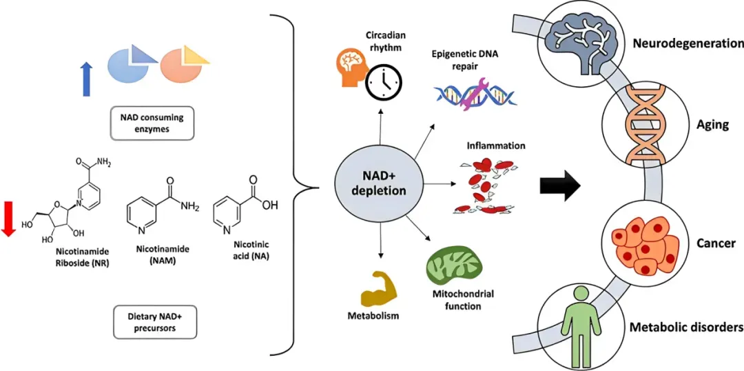 NAD+是细胞内一种至关重要的代谢辅酶,广泛参与能量代谢、线粒体功能维持、DNA 修复、细胞信号传导、表观遗传调控及自噬等关键生理过程。然而,大量研究证实,随年龄增长,多个组织与器官系统中的细胞内 NAD+水平呈现进行性下降。在多种模式生物中,恢复 NAD+水平已被证明可重建细胞与生理功能。因此,通过补充其前体物质来提升 NAD+水平,已成为探索延缓衰老、改善健康寿命最具可行性的策略之一。