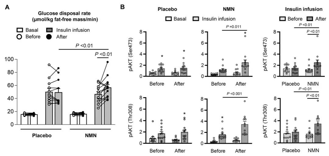 研究明确证实,口服NRNMN能够在短期内(约10天)安全、持续地提升人体血液中的NAD+水平[6]。一项于2021年发表的针对糖尿病前期女性的临床研究显示[7]NMN显著提高了受试者的肌肉胰岛素敏感性,这表明其在改善糖代谢紊乱方面具有直接作用。另一项针对健康中年人的试验通过监测19项临床参数发现[8]NMN能够以剂量依赖的方式提升身体机能,并计算出受试者的生物年龄有所降低,为其衰老干预潜力提供了量化证据。