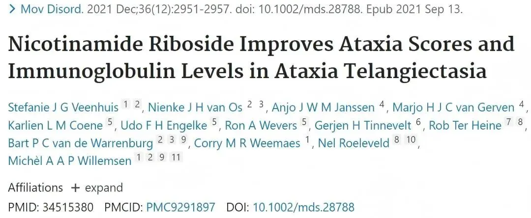 阿尔茨海默病(AD研究方面,一项针对健康成年人的试验发现[13],补充NR能够提高来源于神经元的细胞外囊泡中的NAD+水平,并同时降低与AD病理相关的淀粉样蛋白β42Aβ42)的含量以及促炎信号通路的活性。对于肌萎缩侧索硬化症(ALS),一项在西班牙开展的为期4个月的试点试验表明[14]NR联合Pt对患者安全性良好,且治疗组根据评定量表评估的疾病进展速度显著慢于安慰剂组。此外,一项针对共济失调毛细血管扩张症患者的开放标签研究显示[15]NR补充能改善患者的共济失调症状,且此效果在停止补充后消失,证明了其作用的可逆性和针对性。