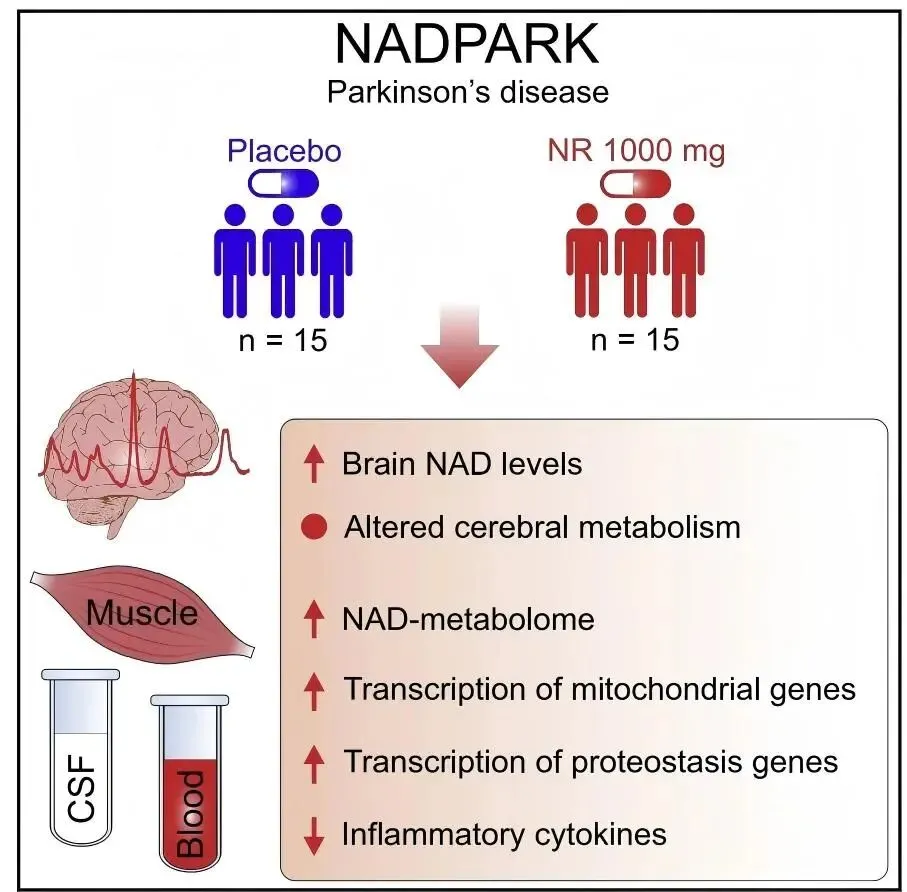 • 帕金森病(PD):在PD患者中,补充NR或NMN可增加大脑NAD⁺水平,改善运动功能,减少神经元损伤。临床试验NCT03816020和NCT03568968正在进一步验证其疗效。