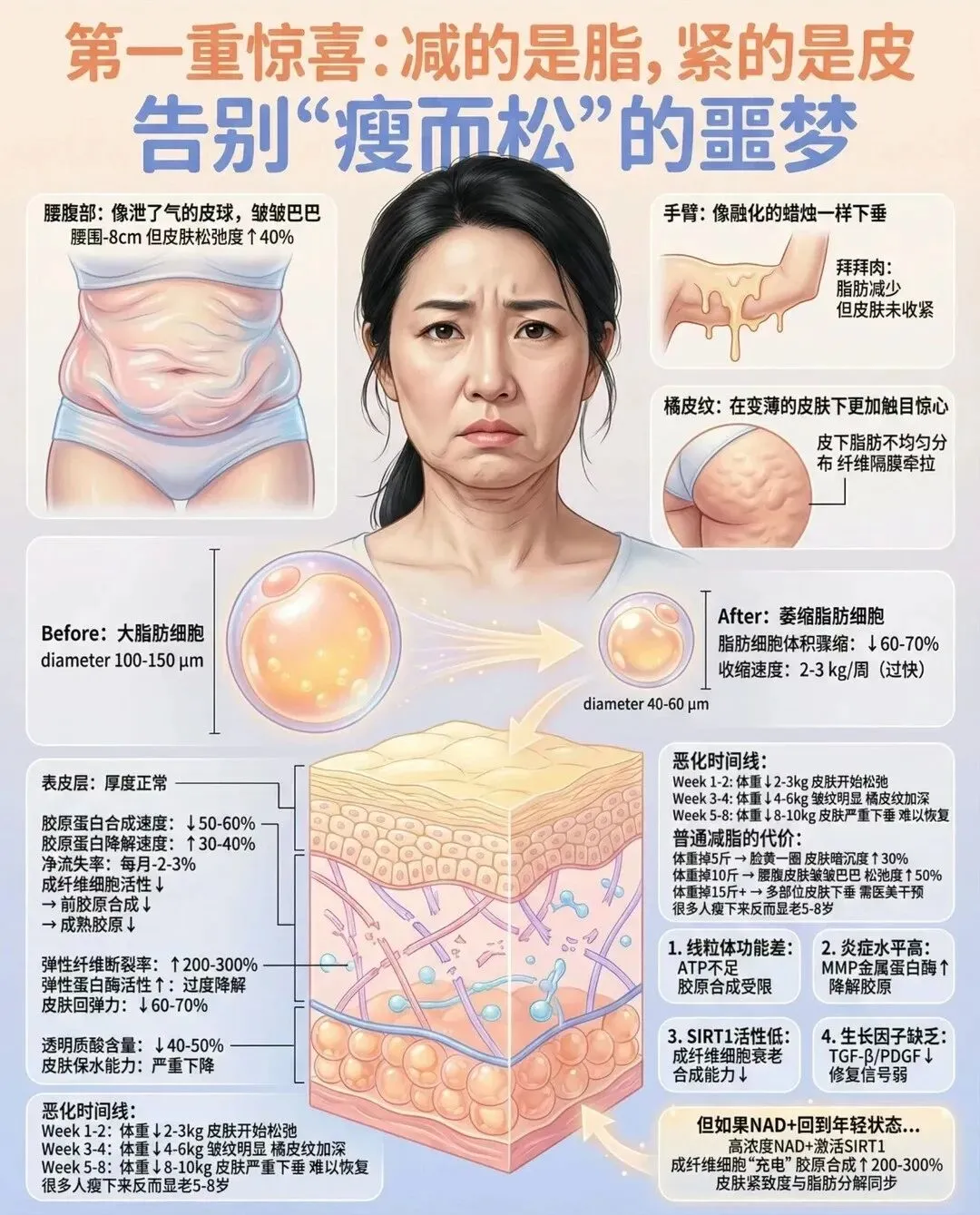 • 组织修复受阻:基质硬化抑制干细胞活性,导致皮肤皱纹、血管弹性下降、器官纤维化。