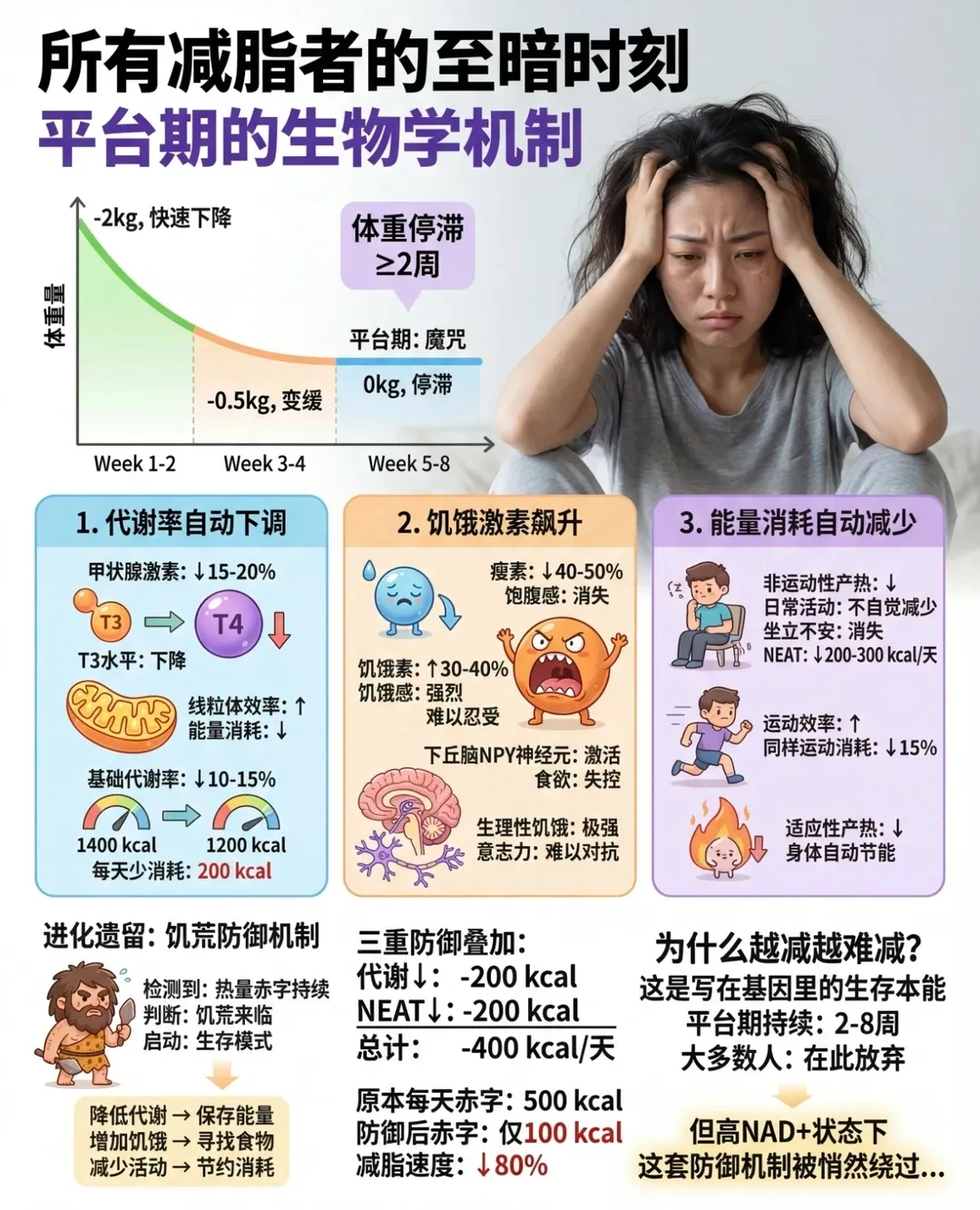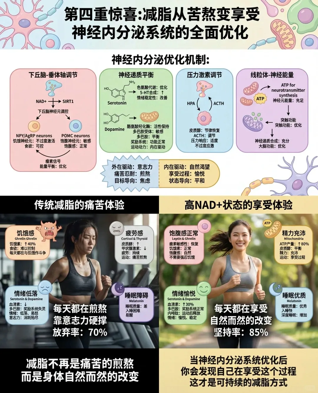 NAD+缺乏会导致大脑内多巴胺、血清素等快乐激素分泌异常,加上长期疲惫、睡眠差,人会变得情绪敏感、易怒暴躁,频繁陷入焦虑、精神内耗,抗压能力大幅下降,高压人群和熬夜党这种表现会格外突出。