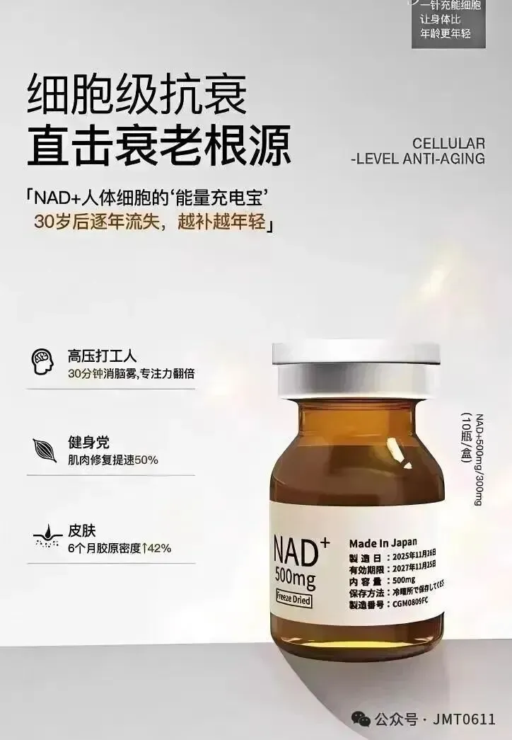 皮下注射NAD⁺具有抑制衰老进程的效果,有望恢复全身机能并防止衰老。通过注射直接补充 NAD⁺ 可迅速提高体内 NAD⁺ 水平,支持细胞修复和再生。