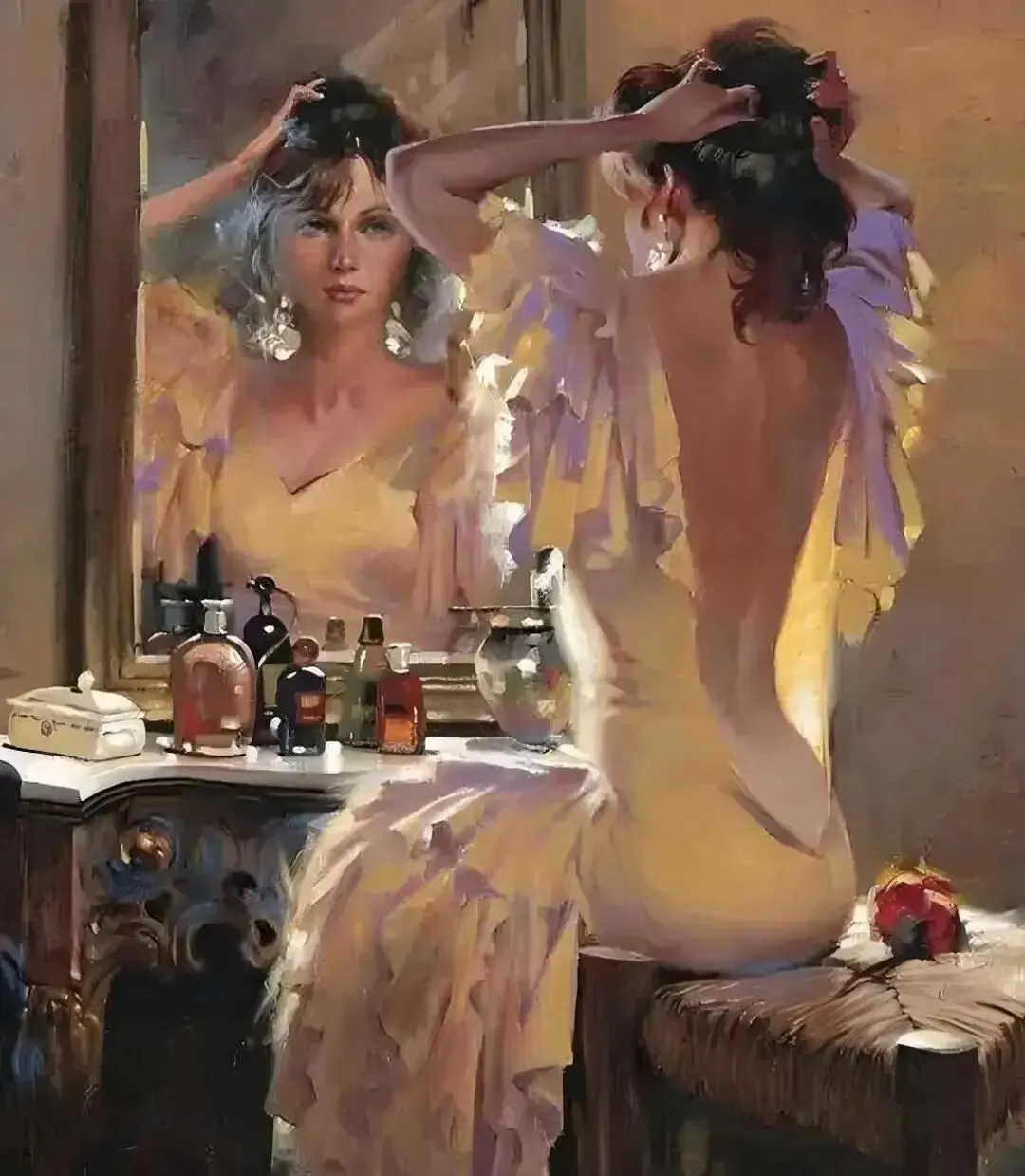 凳子上的那朵红玫瑰🌹,和她的那身凹凸有致的衣裙折射了女主此时此刻的心境!她坐在梳妆台前的曼妙背影,以及对镜梳理发型时的左右顾盼,说明她今天有一场非常重要的约会要参加,这是她的终身大事,自然是怀着不安而又充满着欣喜的心情!