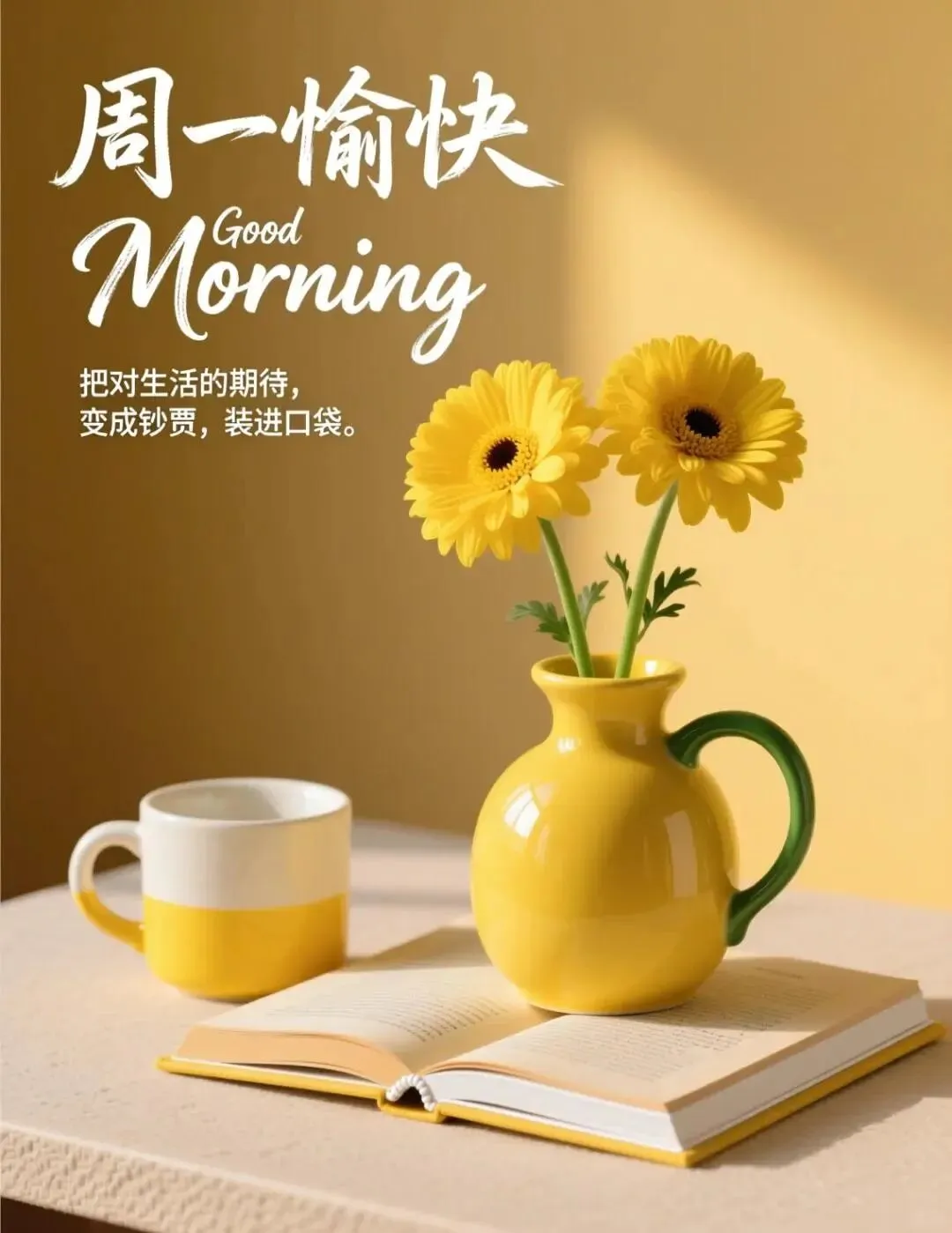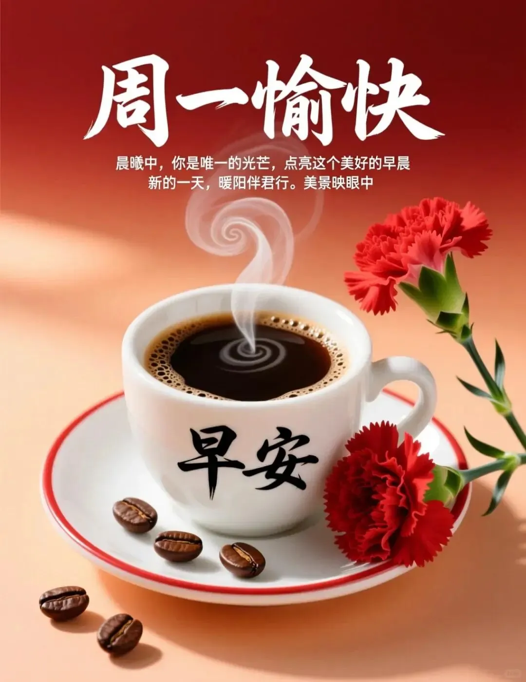 2. ☕周一早安!新的一周,新的开始。告别懒散,收起浮躁,带着信心和底气,迎接新的挑战。生活从来都是越努力越幸运,越从容越自在。愿你工作不慌不忙,日子有滋有味,烦恼少一点,快乐多一点,一路被温柔以待。