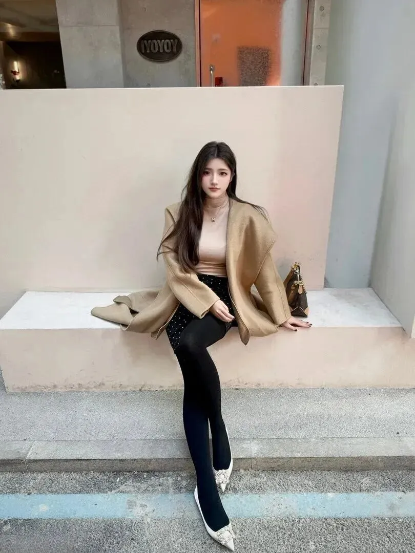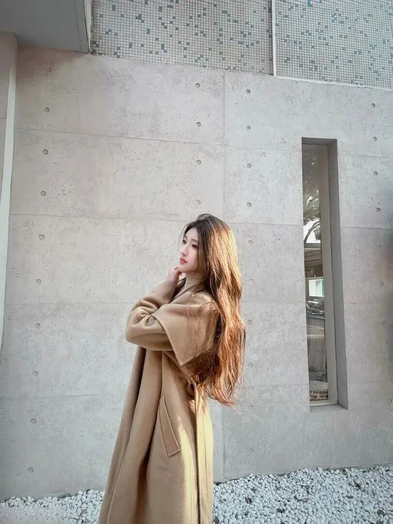 小姐姐很聪明,在这层上加了一件米色的半高领针织衫,颜色偏浅,和大衣十分协调。她面对的是水泥墙,然而大衣更加柔软了。对比之后立刻能记住。