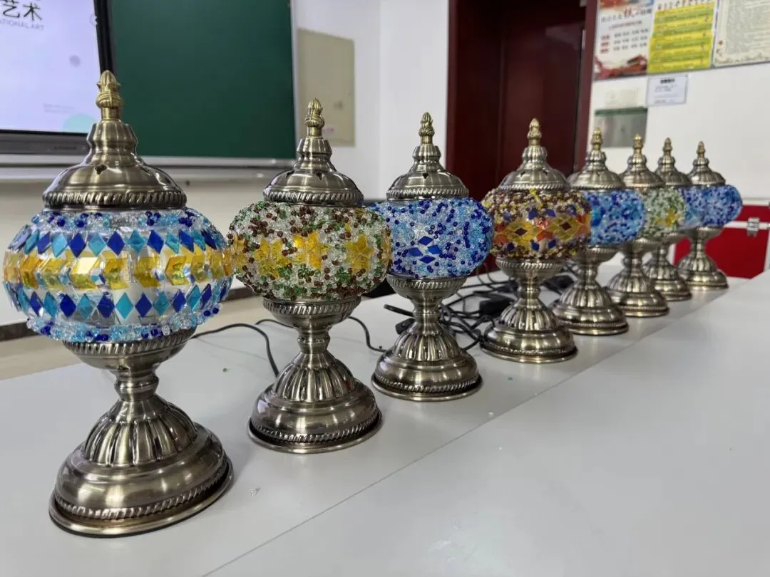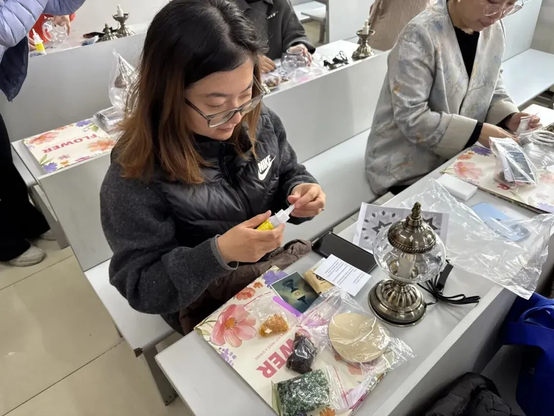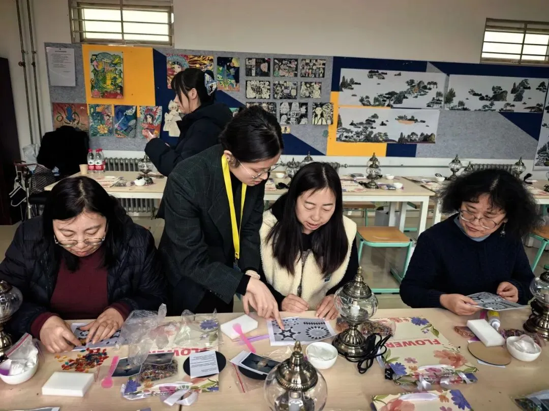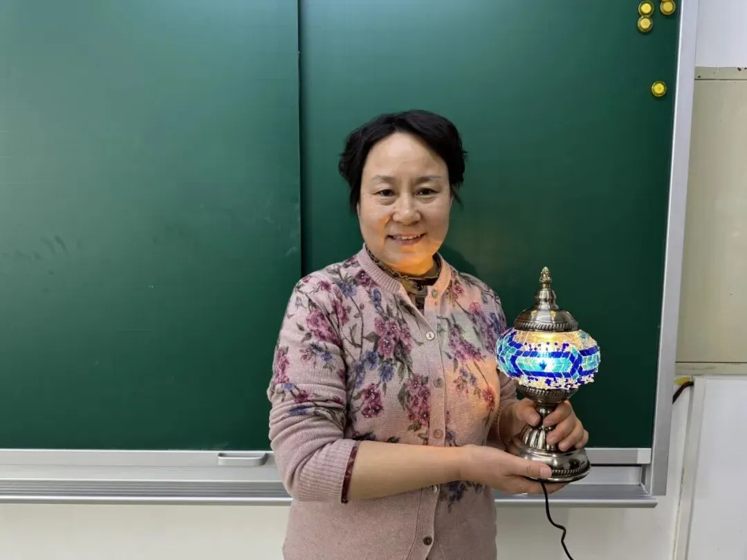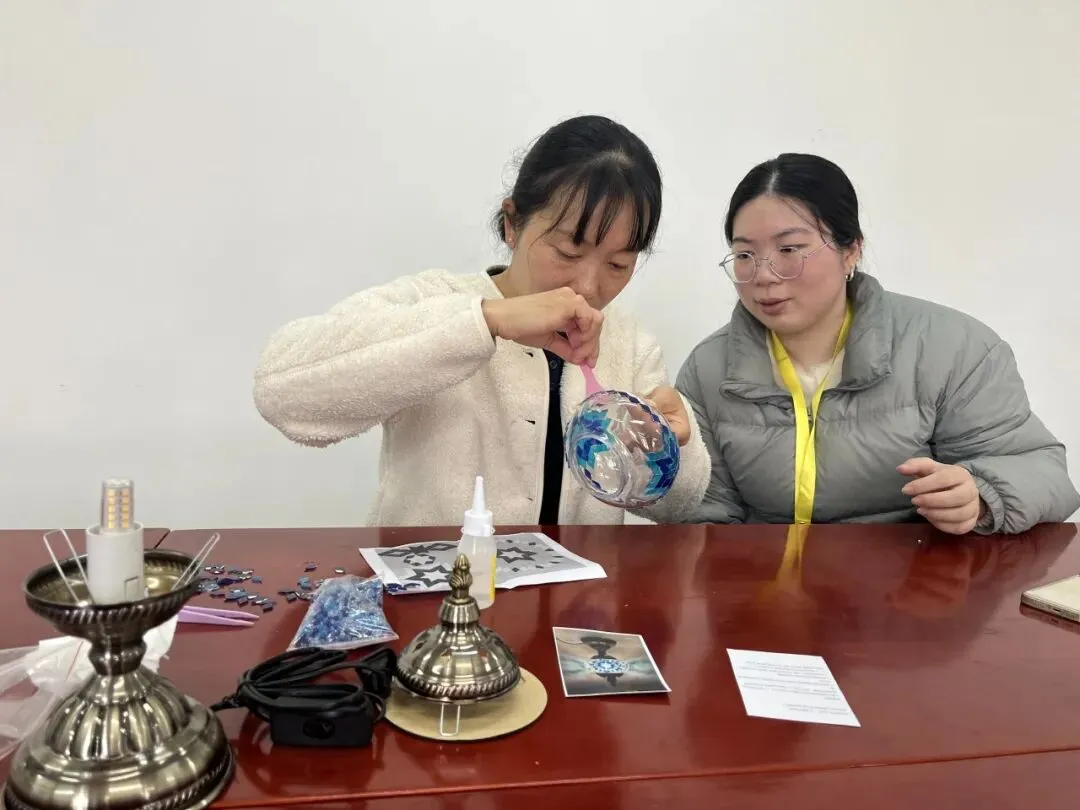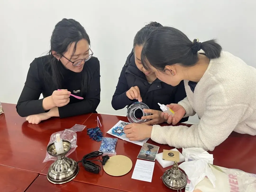 活动现场,温馨雅致。大家在老师的指导下,精心挑选琉璃、创意搭配色彩、细心组装拼接,将匠心与巧思融入每一个细节。从零散的组件到一盏盏光影温柔的琉璃台灯,指尖流转的是艺术之美,心中满溢的是治愈与欢喜。老师们相互交流、彼此协助,欢声笑语此起彼伏,在忙碌的教学工作之余,卸下疲惫、舒缓压力,收获了独属于自己的节日小确幸。