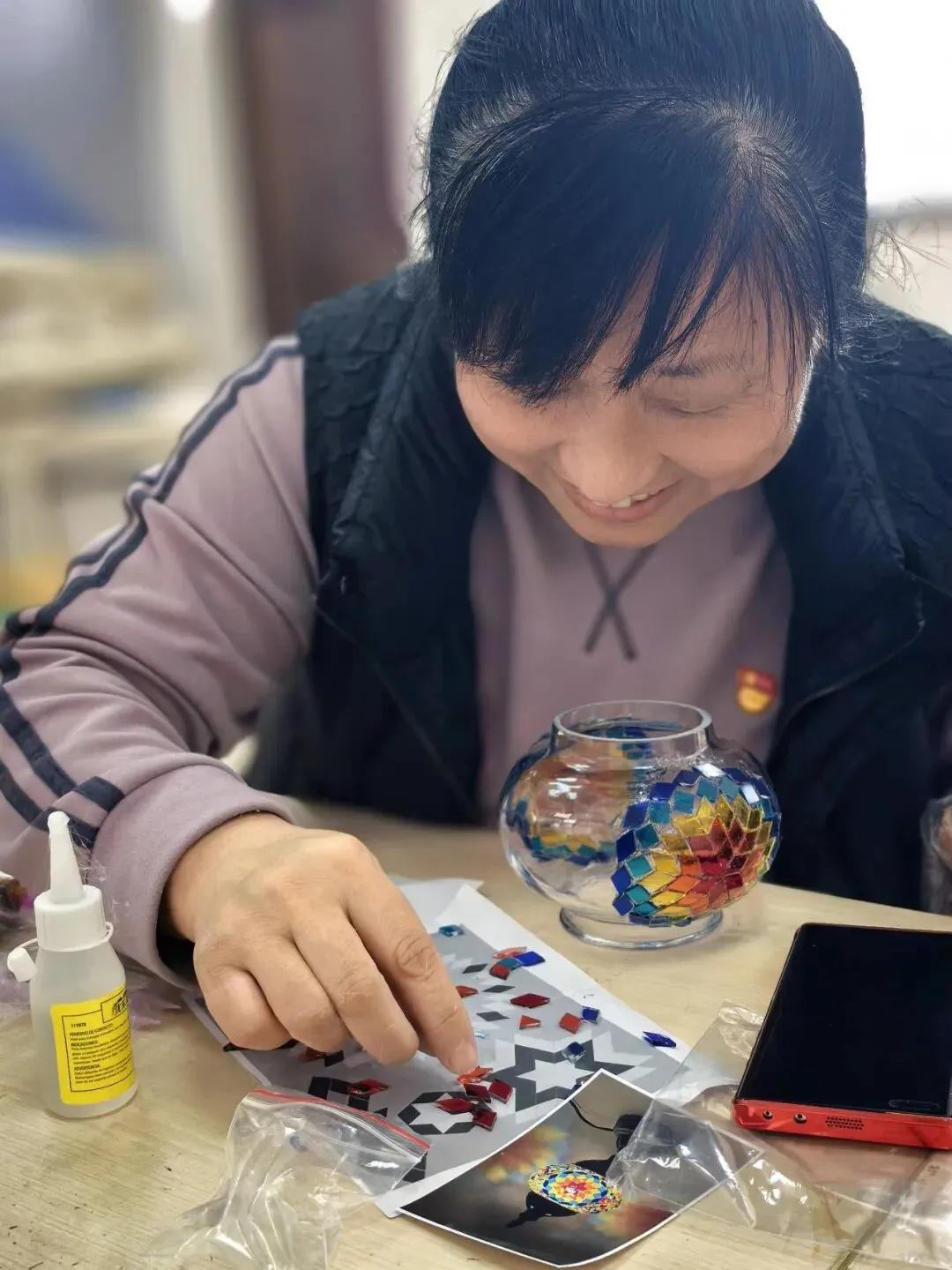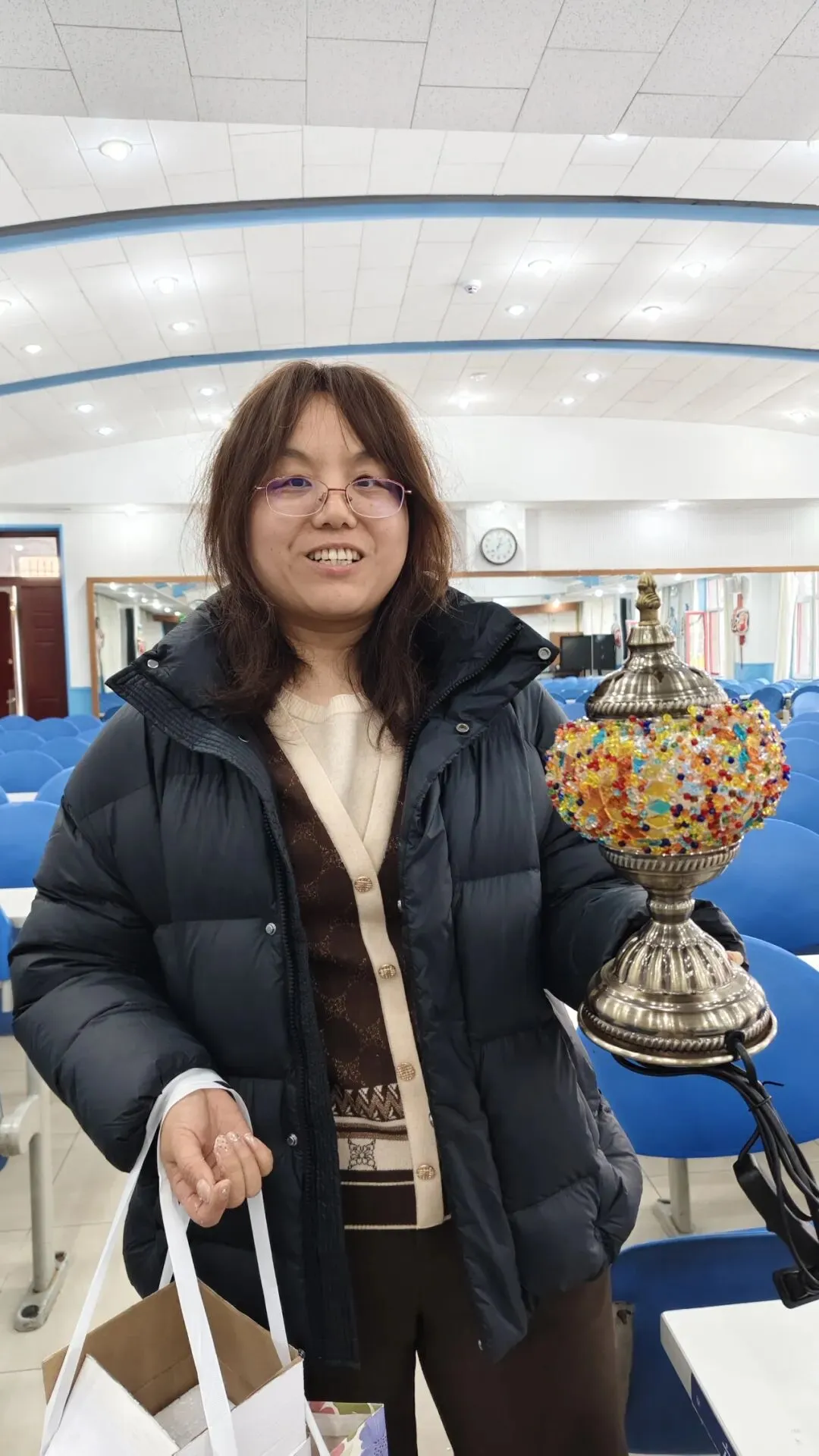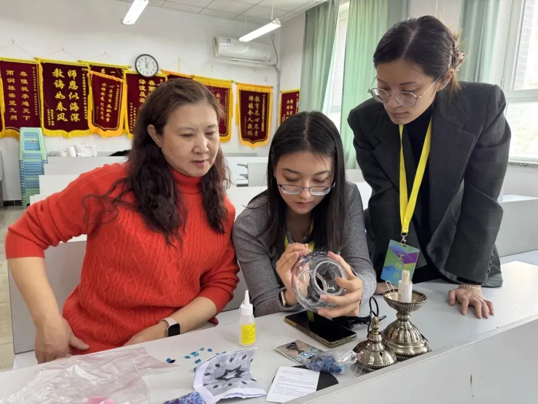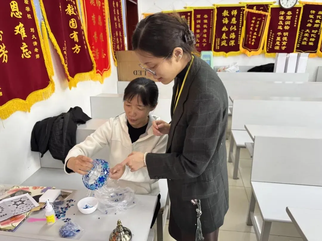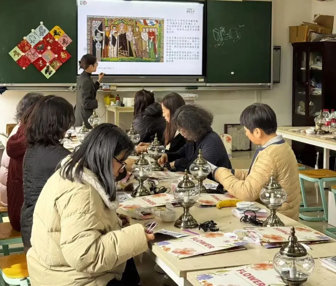 活动现场,温馨雅致。大家在老师的指导下,精心挑选琉璃、创意搭配色彩、细心组装拼接,将匠心与巧思融入每一个细节。从零散的组件到一盏盏光影温柔的琉璃台灯,指尖流转的是艺术之美,心中满溢的是治愈与欢喜。老师们相互交流、彼此协助,欢声笑语此起彼伏,在忙碌的教学工作之余,卸下疲惫、舒缓压力,收获了独属于自己的节日小确幸。