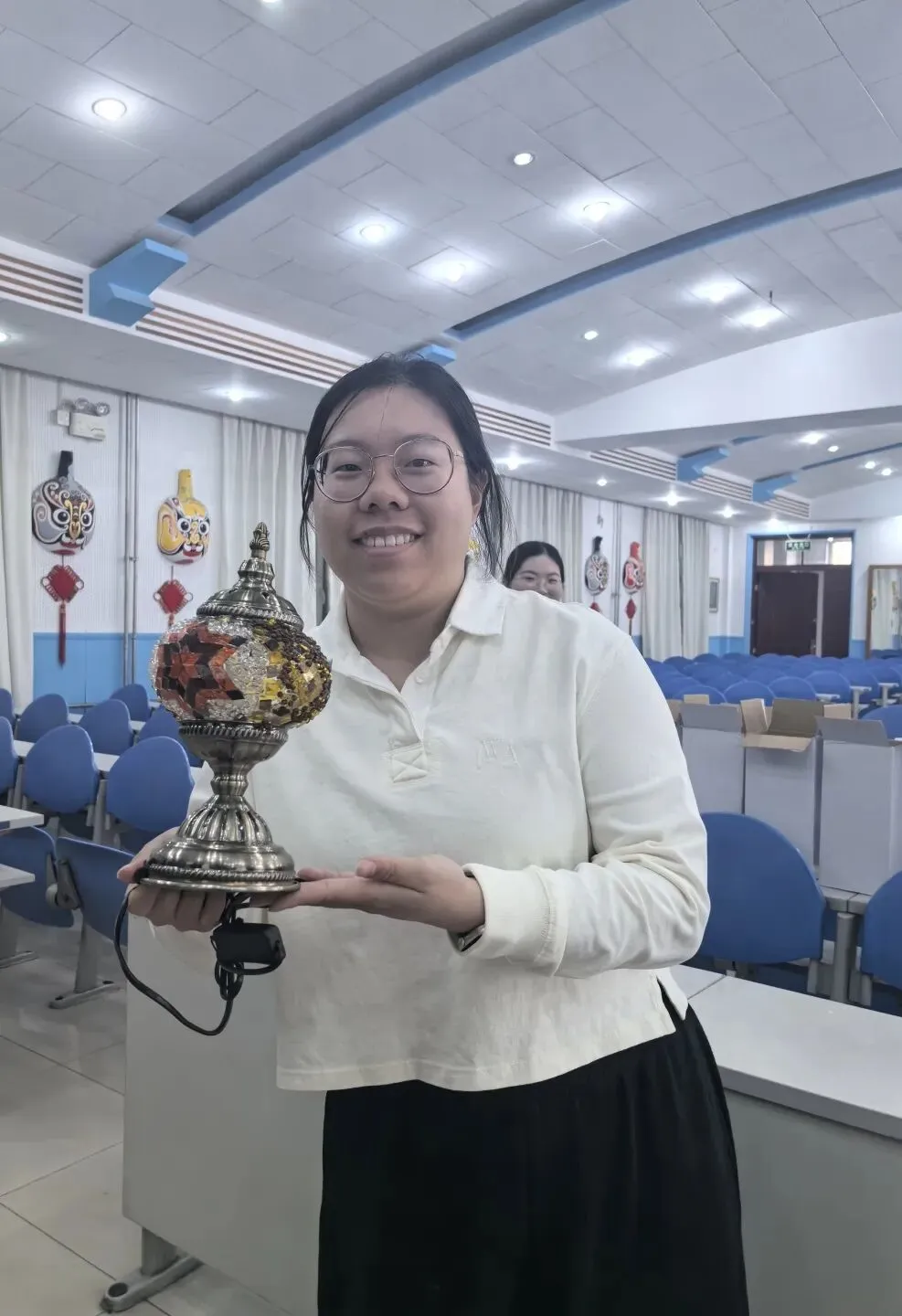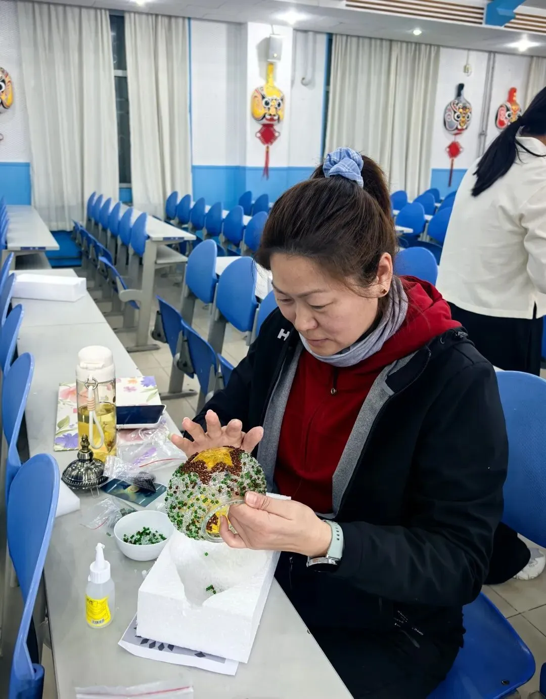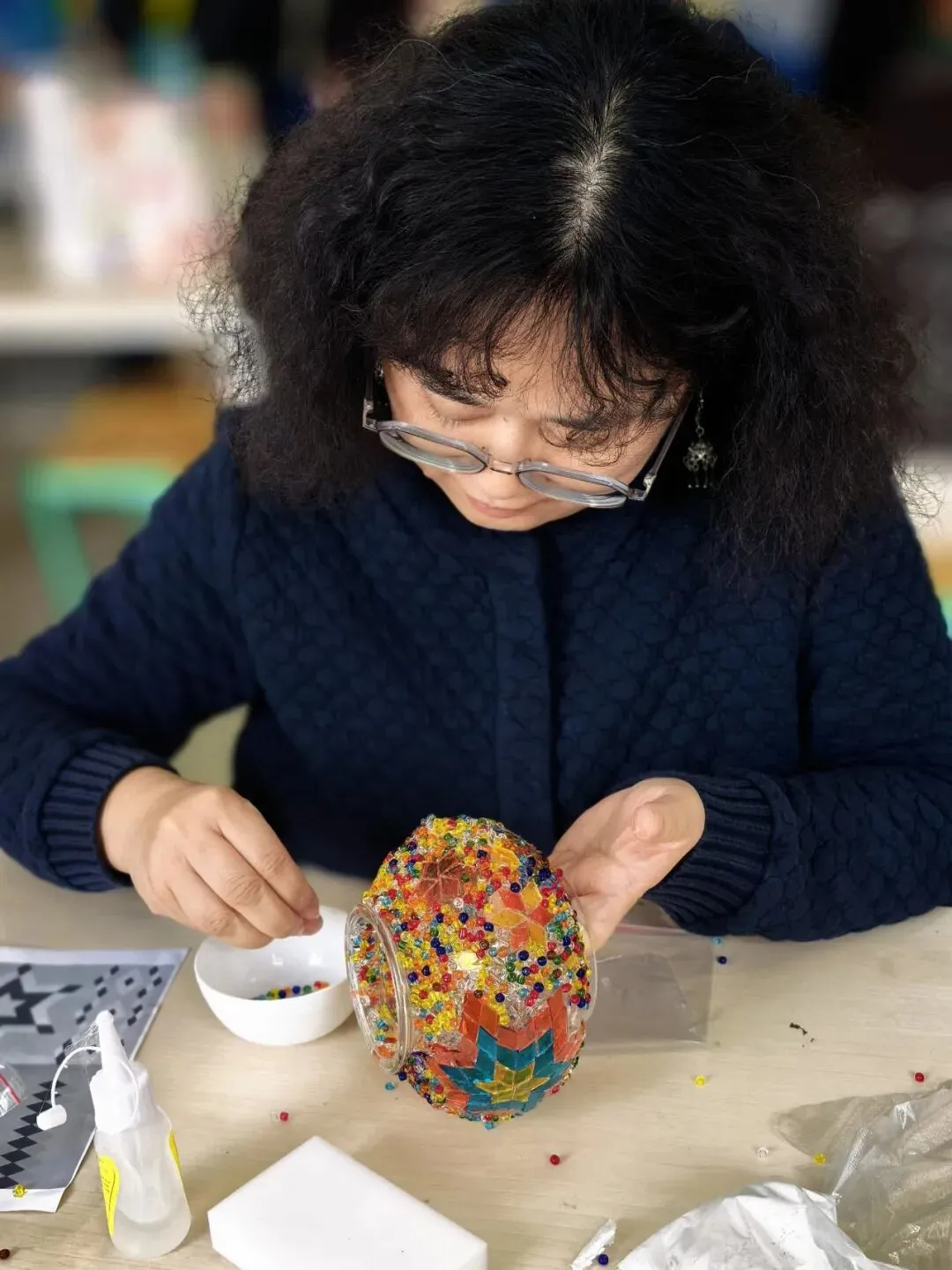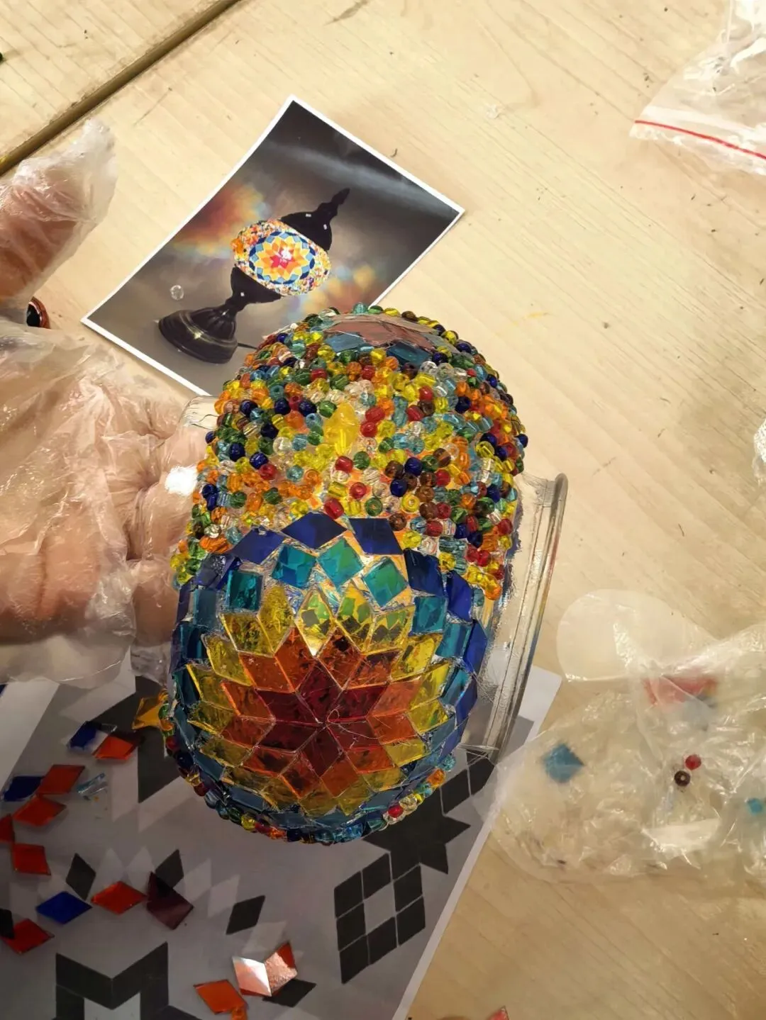 活动现场,温馨雅致。大家在老师的指导下,精心挑选琉璃、创意搭配色彩、细心组装拼接,将匠心与巧思融入每一个细节。从零散的组件到一盏盏光影温柔的琉璃台灯,指尖流转的是艺术之美,心中满溢的是治愈与欢喜。老师们相互交流、彼此协助,欢声笑语此起彼伏,在忙碌的教学工作之余,卸下疲惫、舒缓压力,收获了独属于自己的节日小确幸。