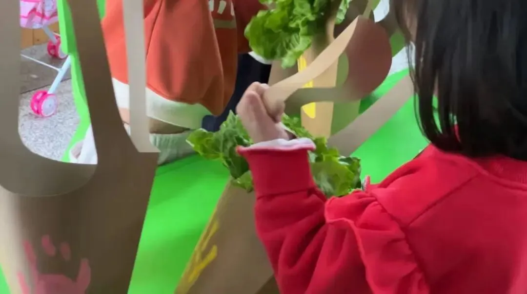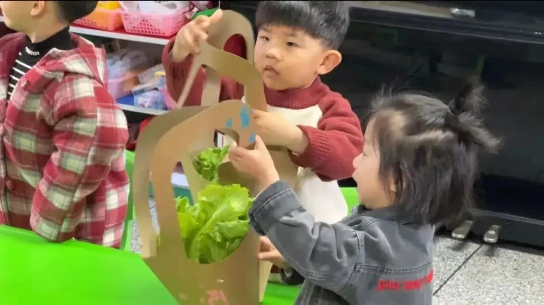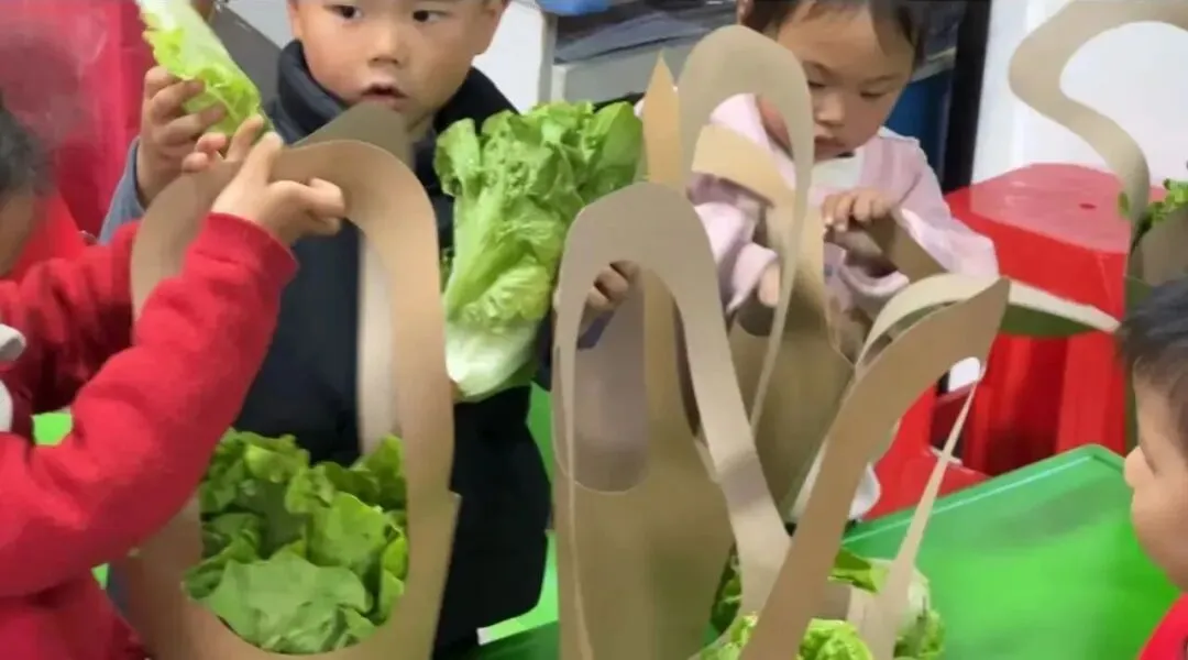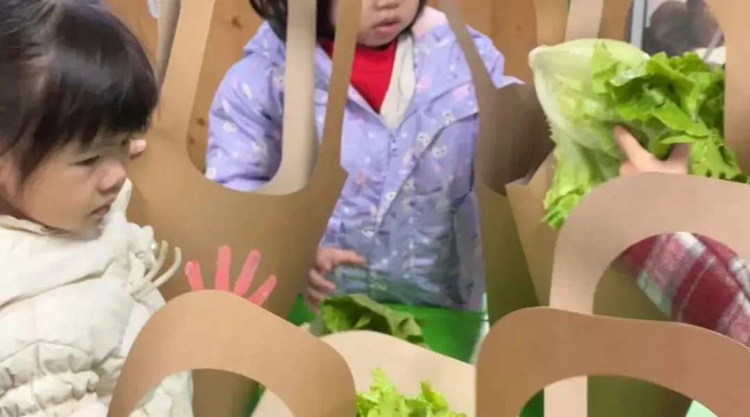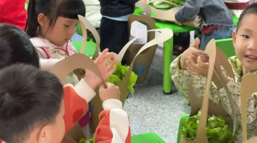 小班的萌娃们化身小小花艺师,开启了一场充满趣味的生菜花创作之旅。新鲜翠绿的生菜在宝贝们的小手里,经过整理、包装,再系上美丽的丝带,摇身一变成为一束束别致又充满美好寓意的生菜花。