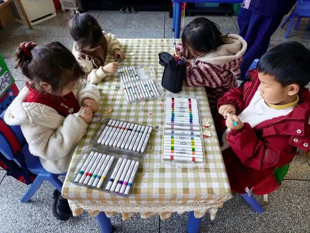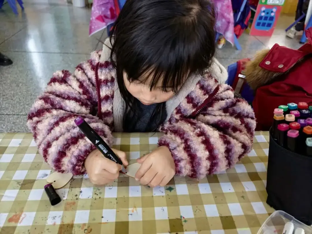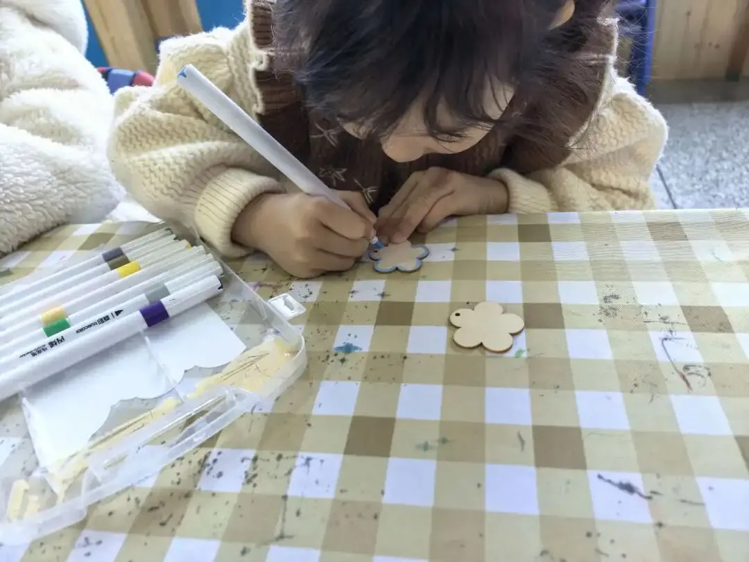 孩子们用彩笔在木质底托上尽情创作,有的画出春日里的缤纷花朵,有的勾勒出星空下的梦幻色彩,还有的把对妈妈、老师的爱,化作爱心、星星等可爱图案。从挑选形状各异的木质底托,到用画笔精心描绘,再到安装上精致的耳钩,每一个步骤都饱含着专注与用心。