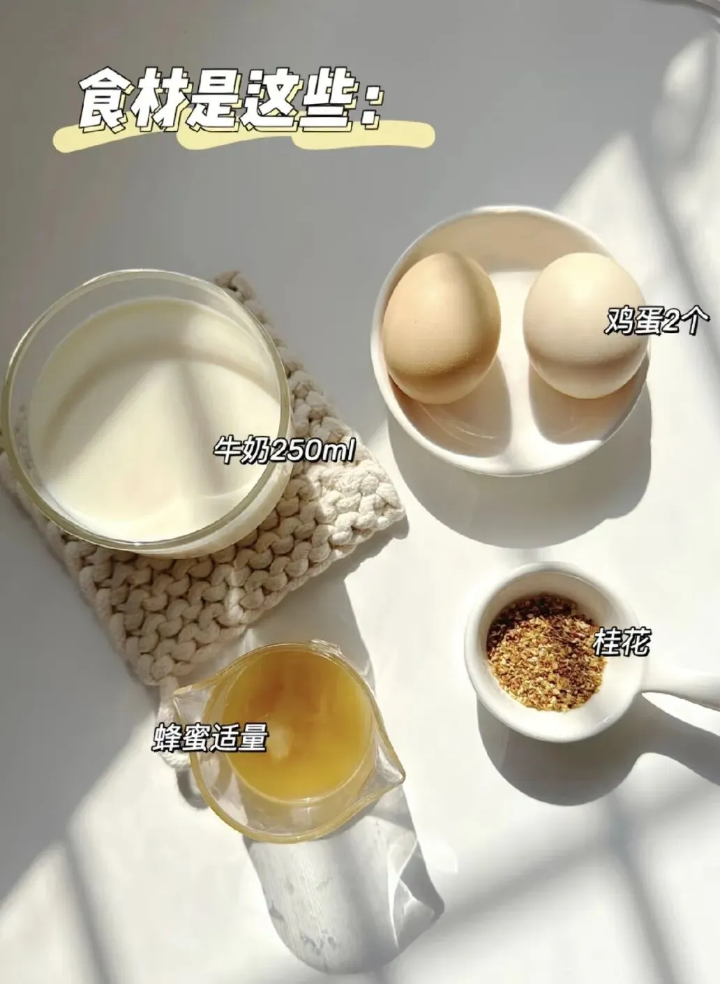 基础食材:牛奶250ml、鸡蛋2个、蜂蜜适量、干桂花少许