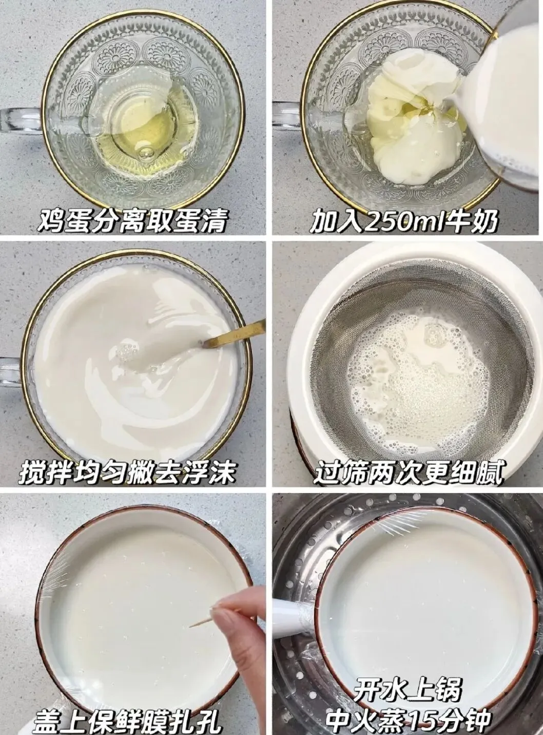 2.表面不光滑?要么是没有盖保鲜膜,要么是没有撇去浮沫、没有过筛,记住一定要盖保鲜膜扎孔,并且提前撇沫、过筛,这两步不能省。